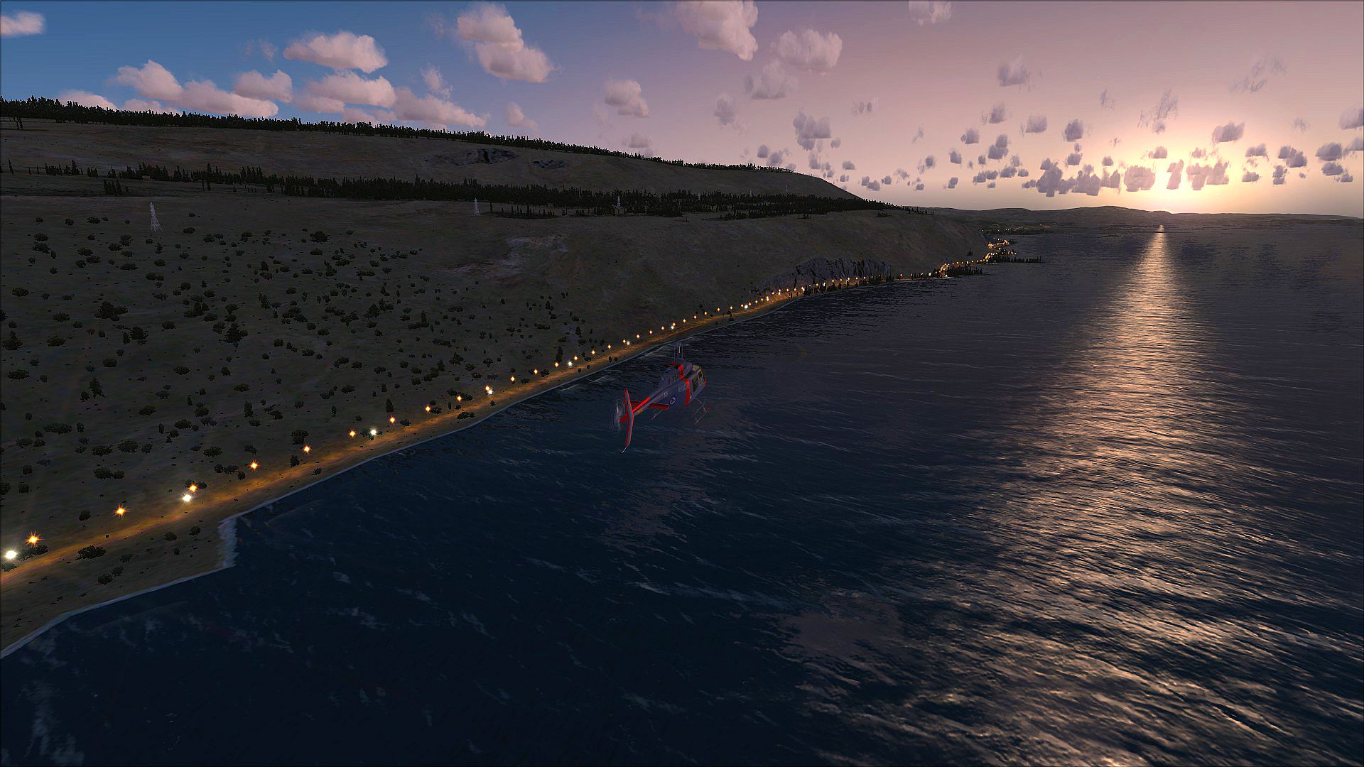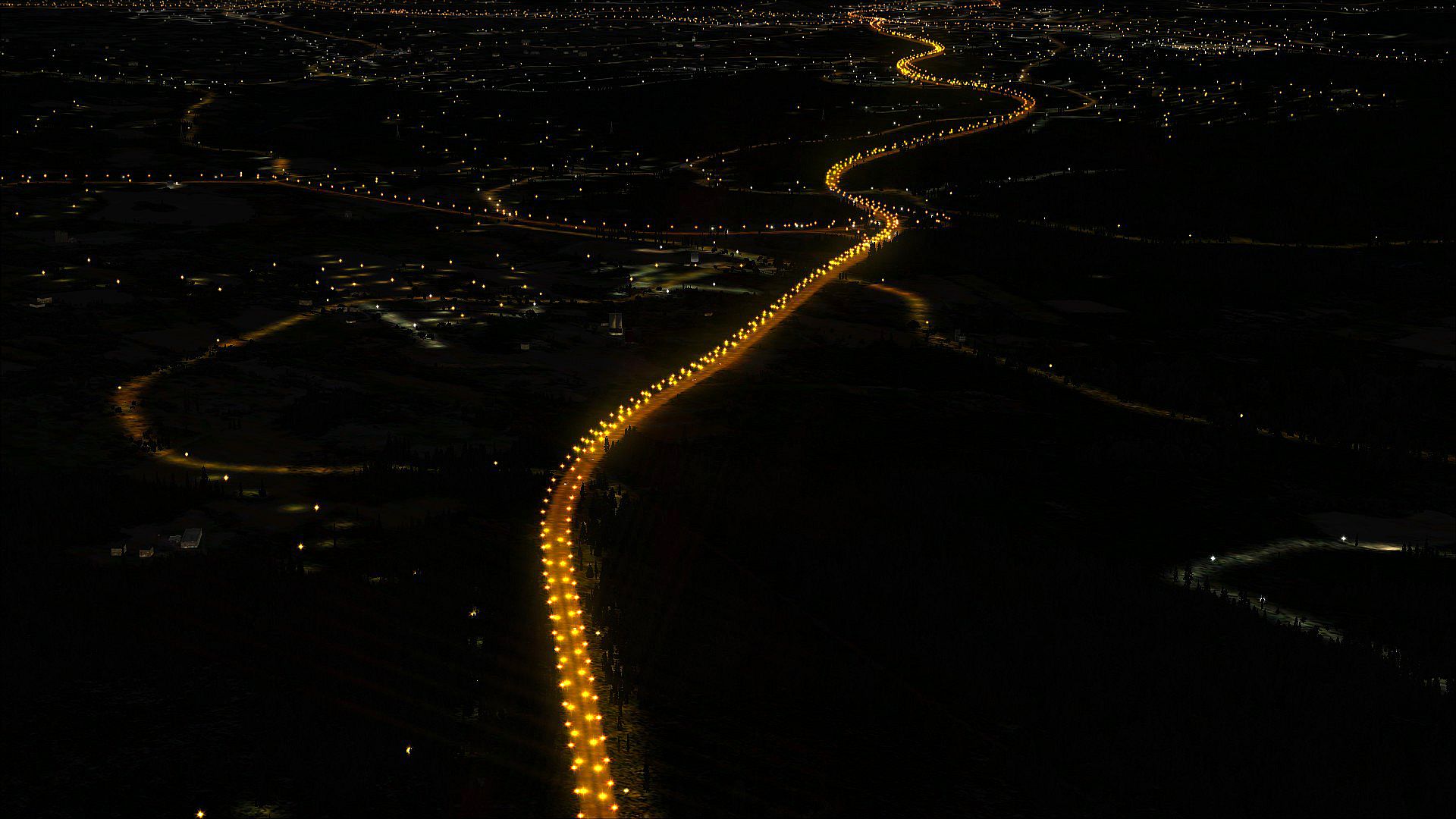 The Night Environment database contains an incredible amount of accurate road data, illuminating roads at night which you wouldn’t normally see. Our lights have up to a 60 mile radius, so large urban areas and highway junctions will illuminate all around you as you fly. As the highway lights are raised above the surface and have a lit bitmap below them, a realistic 3D effect is created.