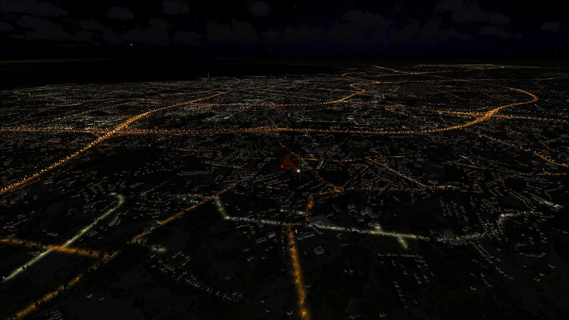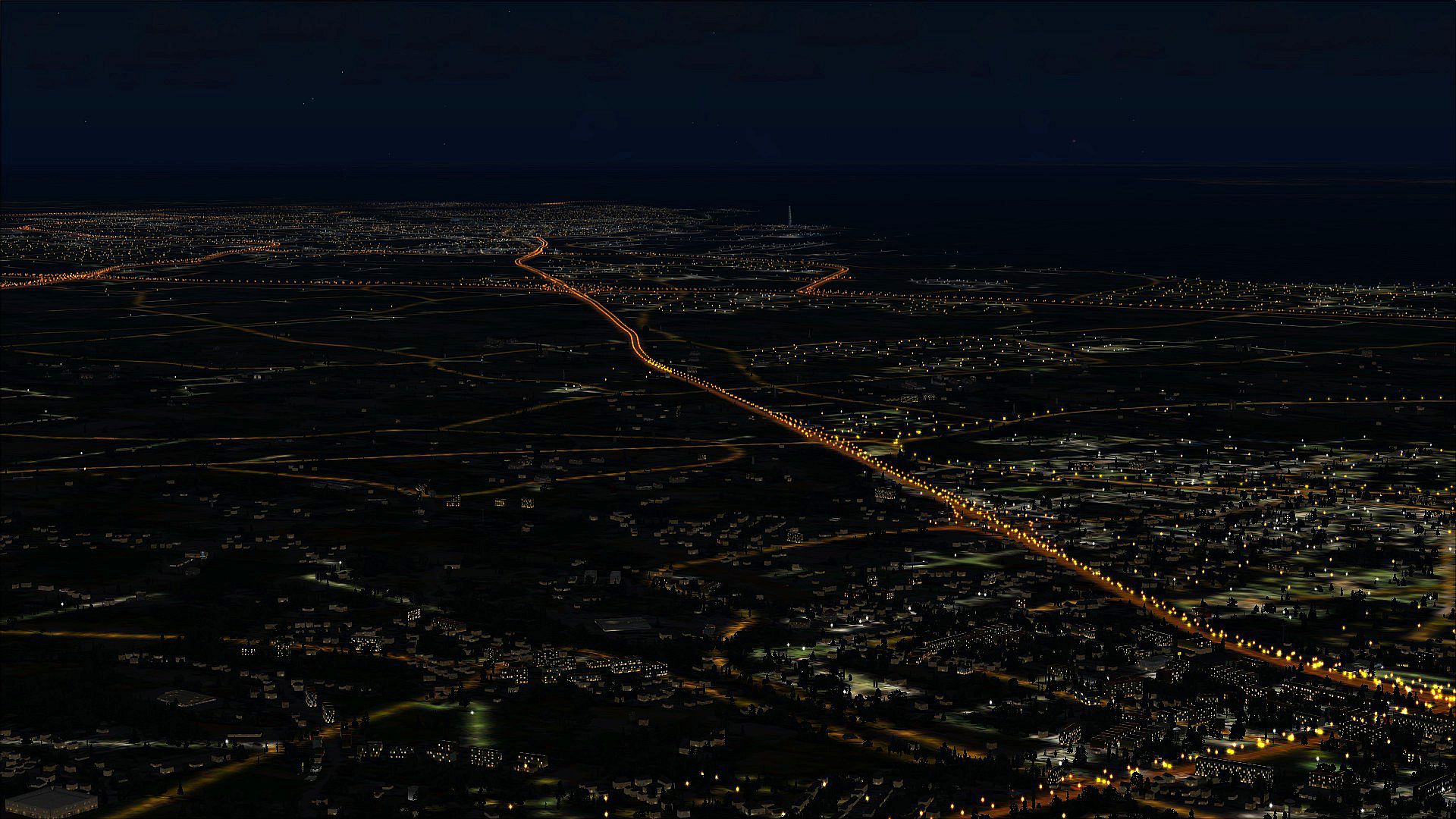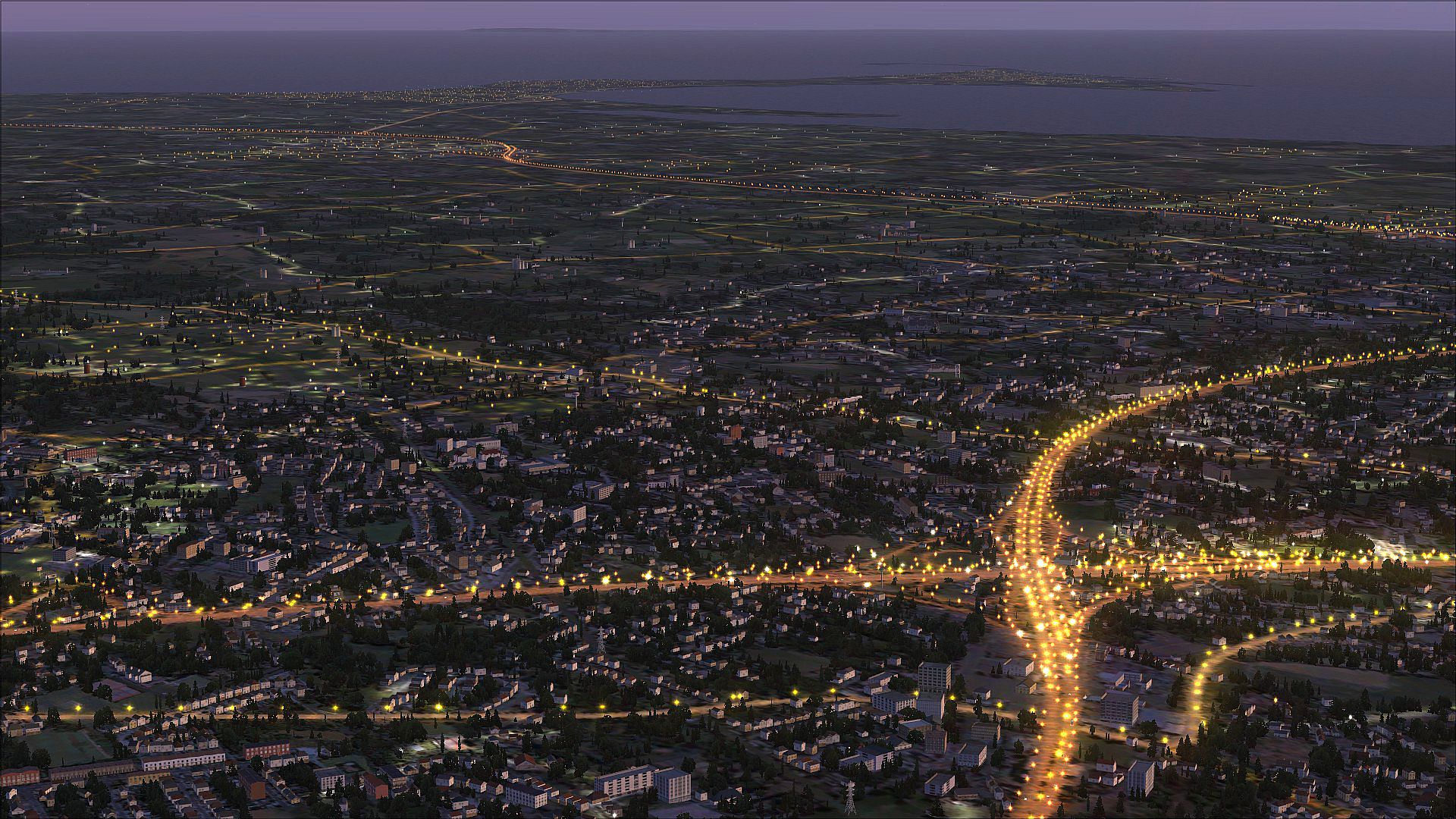 The Night Environment database contains an incredible amount of accurate road data, illuminating roads at night which you wouldn’t normally see. Our lights have up to a 60 mile radius, so large urban areas and highway junctions will illuminate all around you as you fly. As the highway lights are raised above the surface and have a lit bitmap below them, a realistic 3D effect is created.