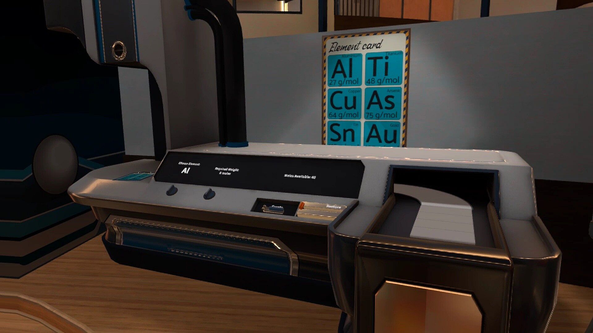 This escape room challenges your knowledge of moles! Use the substance dispenser to create metals by the amounts of moles. Place the correct metal amounts on the scales to retrieve a bottle of mercury. Use the difference in density between mercury and iron to recover the key and escape the room.