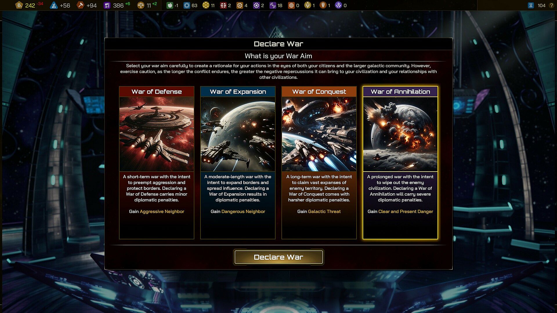 • War Aims: Set the scope and intensity of your wars. Choose from four escalating war aims, each affecting the diplomatic landscape differently, from limited skirmishes to full-scale annihilation. Tailor your warfare strategies without restrictions but beware of the galactic consequences if conflicts drag on too long.