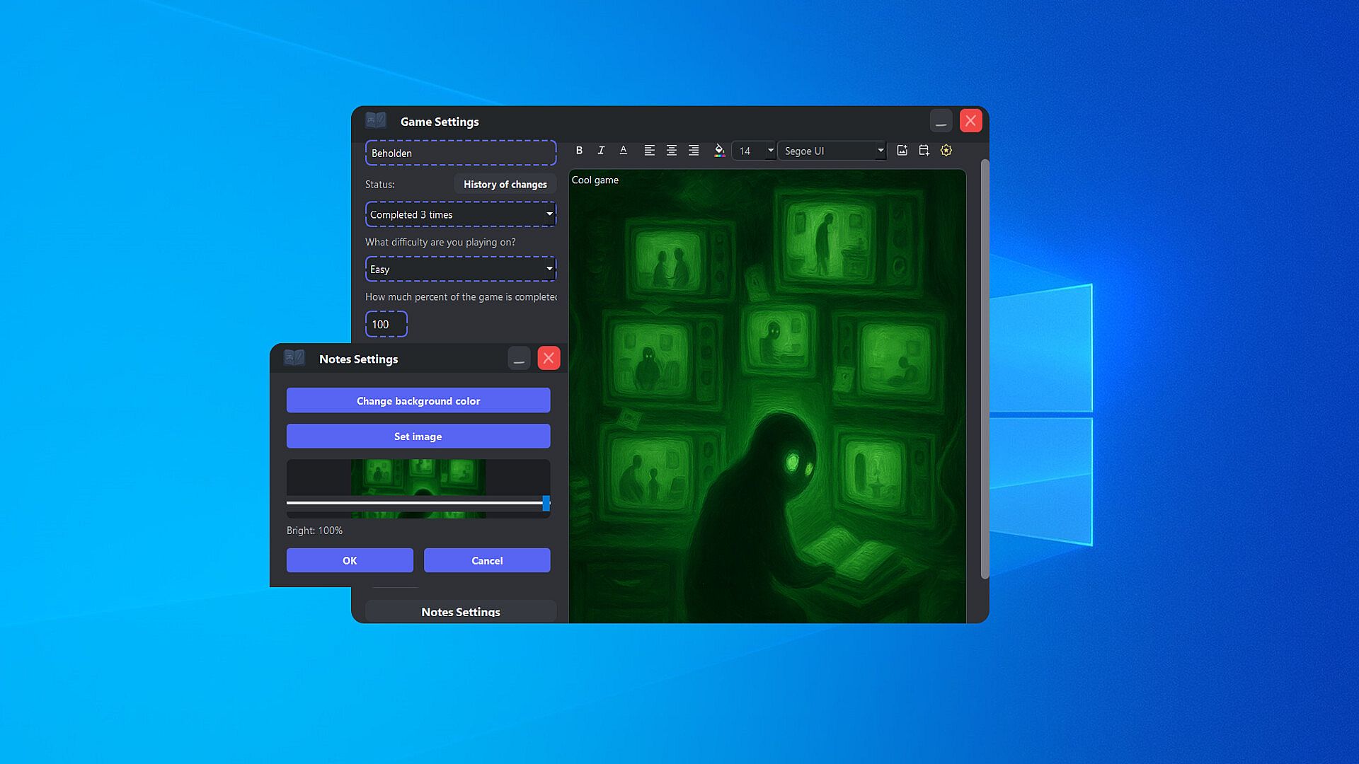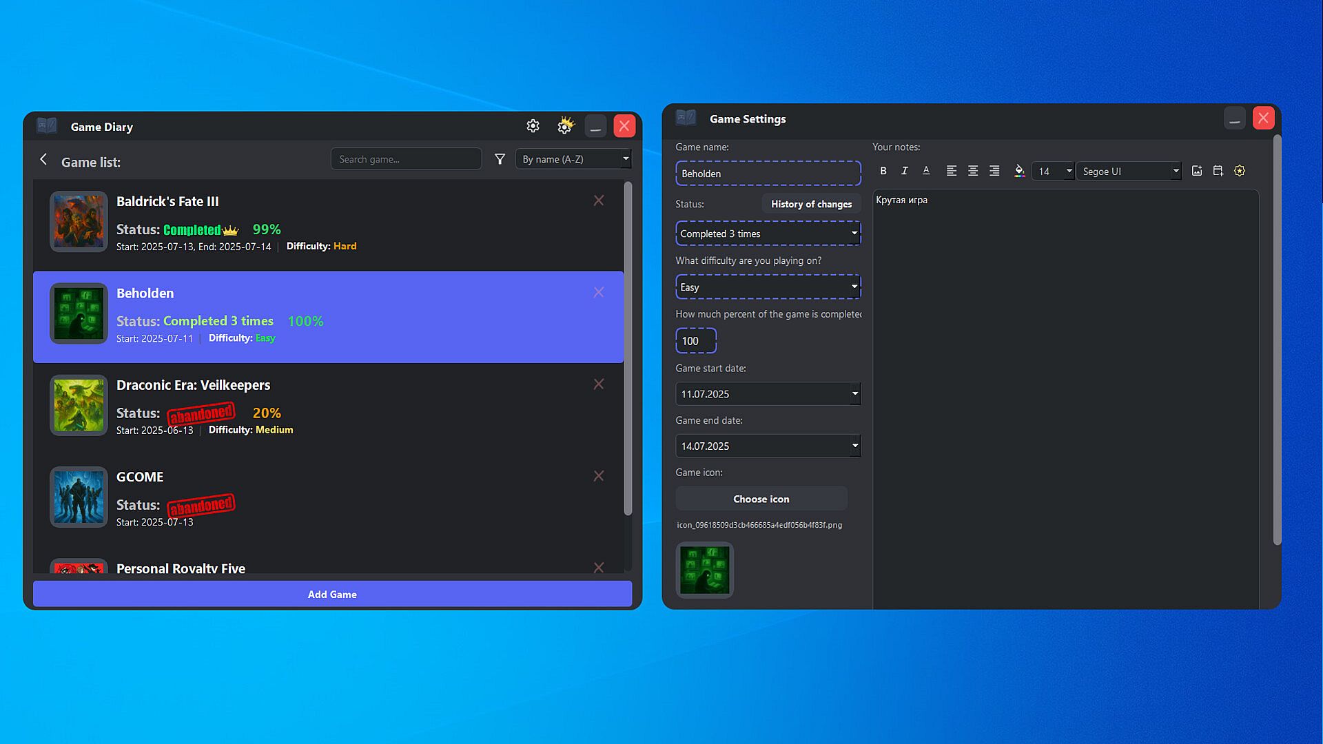 Custom background for notes. Set a unique background for each game's notes to make your diary even more enjoyable and personalized.