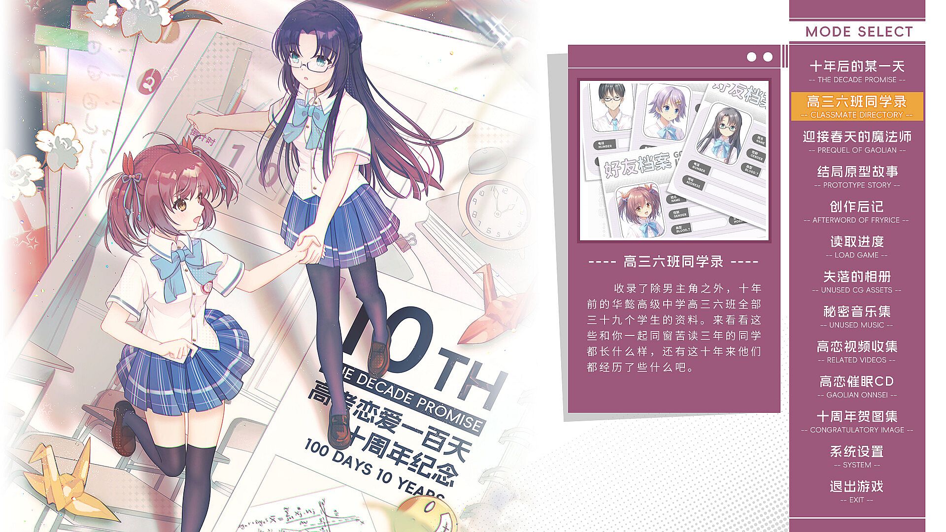 Celebrate a decade of high school romance simulation with short stories like "A Certain Day Ten Years Later," where the 28-year-old male lead faces career and relationship struggles before returning to his alma mater amid school festivities and encounters vibrant underclassmen. Another tale, "The Magician Welcoming Spring," captures odd events just before his confession to Mu Xin. The collection also features the High School Class 6 roster with alumni messages and blessings for the absent protagonist, plus prototype stories behind the original 52 endings revealed by a mysterious graduate. This indie adventure packs creator reflections on how the game reshaped one life, lost assets from a planned sequel, unreleased audio tracks from the bedside CD, and anniversary videos including promos and interviews. Casual simulation fans who cherish detailed character backstories and nostalgic reunions find a treasure trove here. PC players revisit these heartfelt moments through stories, notes, and media that extend the original narrative.