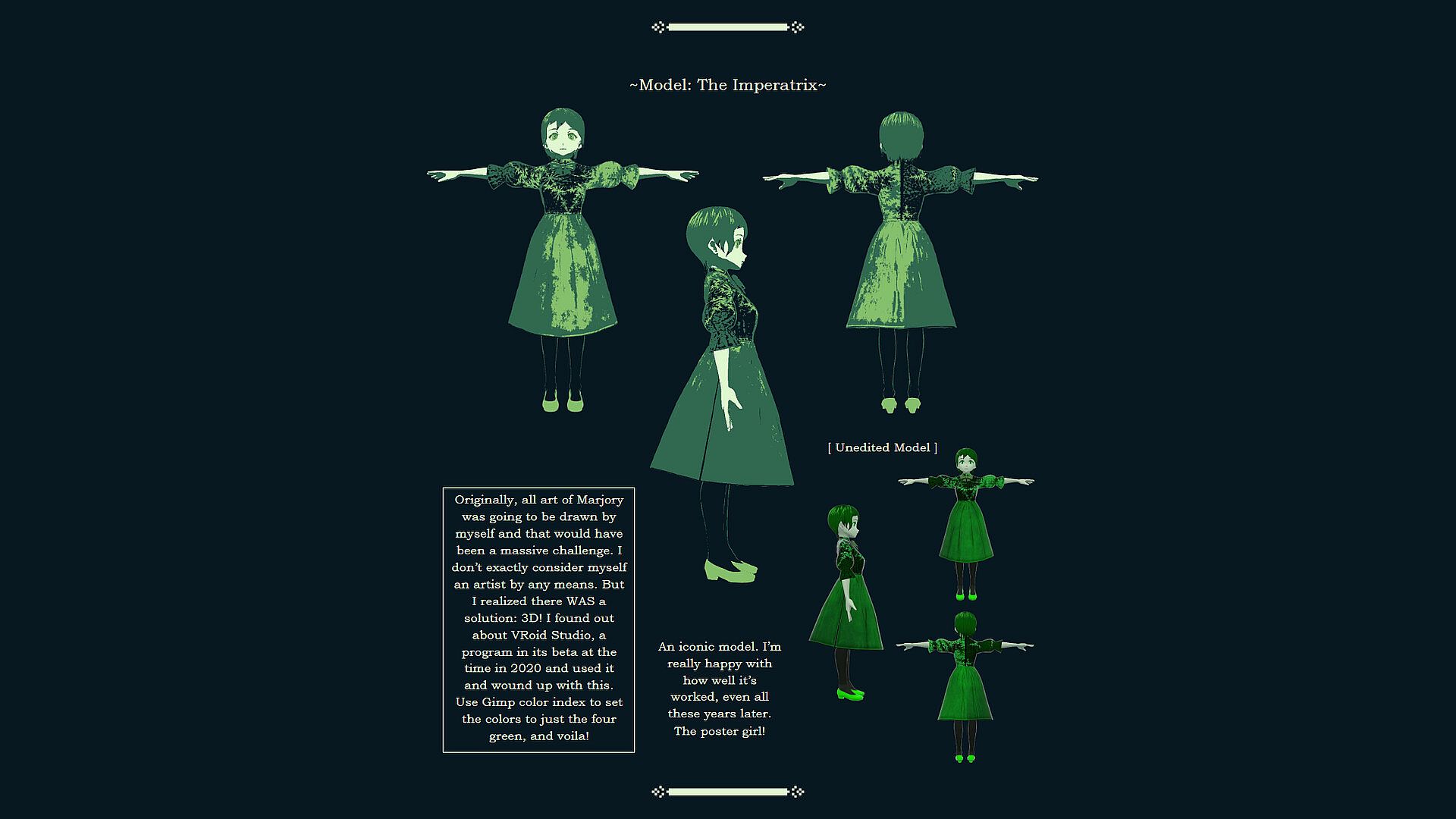 Character Gallery artwork with information about their designs and creation