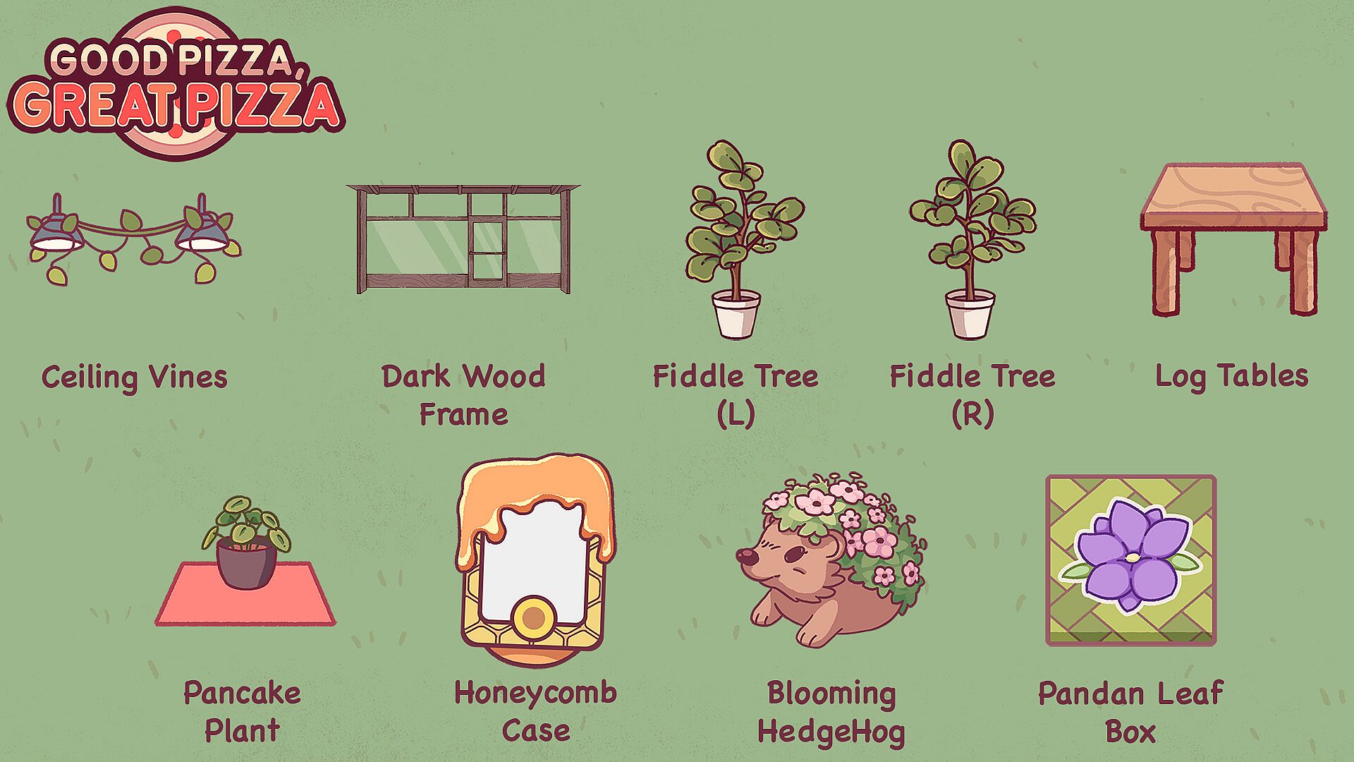 Grab the full set of Earth Day 2021 decorations in Good Pizza, Great Pizza without endless grinding. This bundle delivers Ceiling Vines, Dark Wood Frame, Fiddle Tree Left, Fiddle Tree Right, Log Tables, Pancake Plant, Honeycomb, Blooming Hedgehog, and Pandan Leaf Box for your pizza shop. It skips duplicates if you already own select pieces, so you get just what you need.