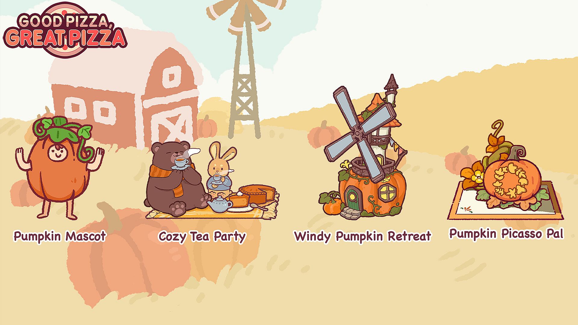 Grab premium animated decors for a limited-time autumn event in Good Pizza, Great Pizza. These items bring seasonal flair with designs like Pumpkin Picasso Pal, Pumpkin Mascot, Cozy Tea Party, and Windy Pumpkin Retreat. Activate or deactivate them anytime through the Decorations tab for flexible use.