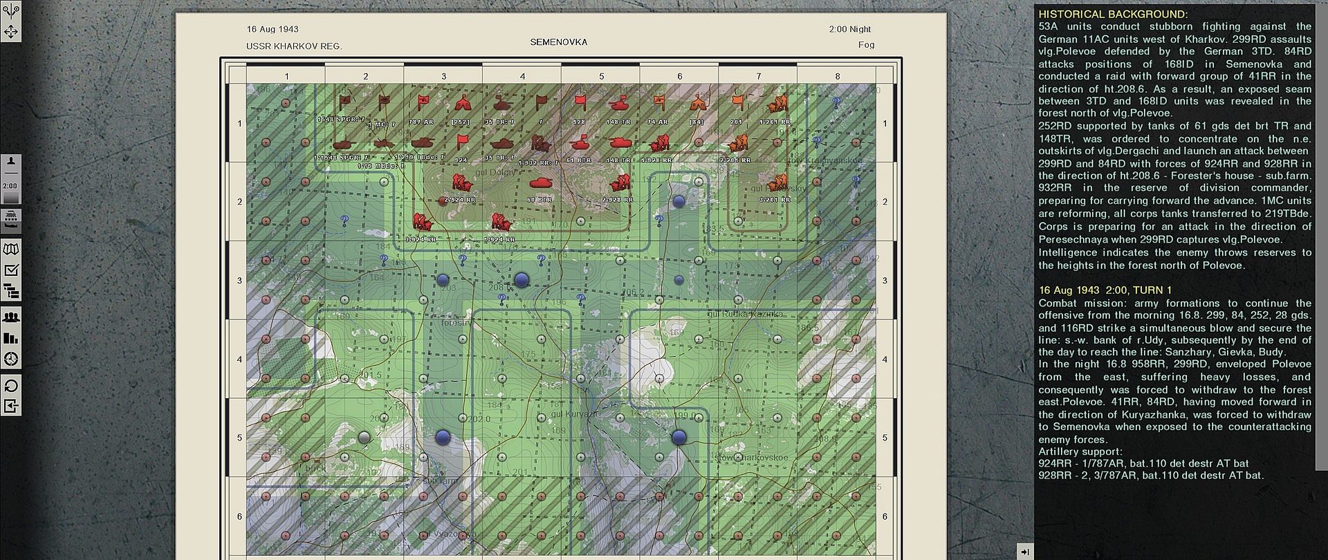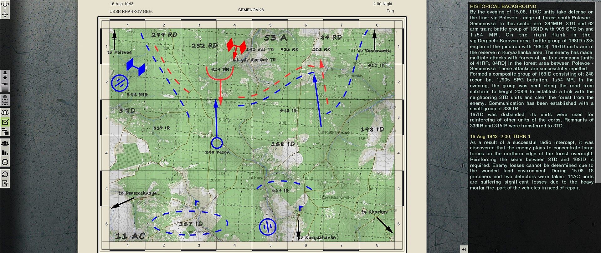 - Two operations of 12 turns for each of the parties (forest southern of Semenovka and Polevoe, August 16-17, 1943).