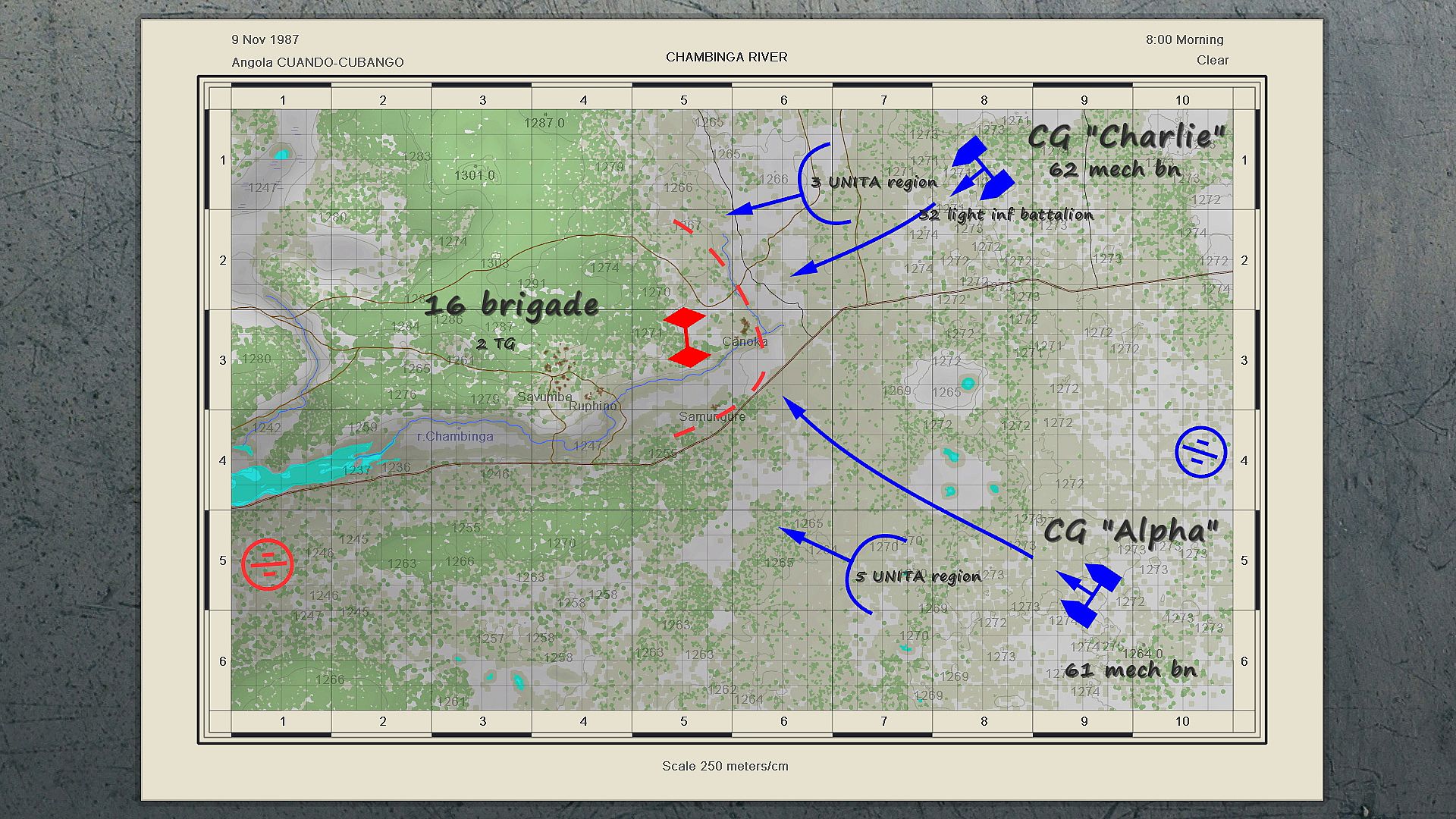 The FAPLA offensive was halted at the line of r.Lomba, where SA forces, together with UNITA, defeated the 47th and caused significant damage to the 21st and 59th FAPLA brigades. In the beginning of November 1987, SA and UNITA launched a series of attacks on FAPLA brigades retreating to Cuito Cuanavale. The 16th brigade remained the most battle-worthy of them, it took defense at the outlet of r.Shambinga. On November 9, battlegroups "Alpha" (61 mech.bn and an UNITA battalion) and "Charlie" (62 Mech.Bn., 4 Inf Bn, 32 Light Inf Bn, an UNITA battalion) began a joint attack. Also, a squadron of the "Olifant" Mk.IA tanks was transferred to the combat area, and was allocated to 62 Mech.Bn.