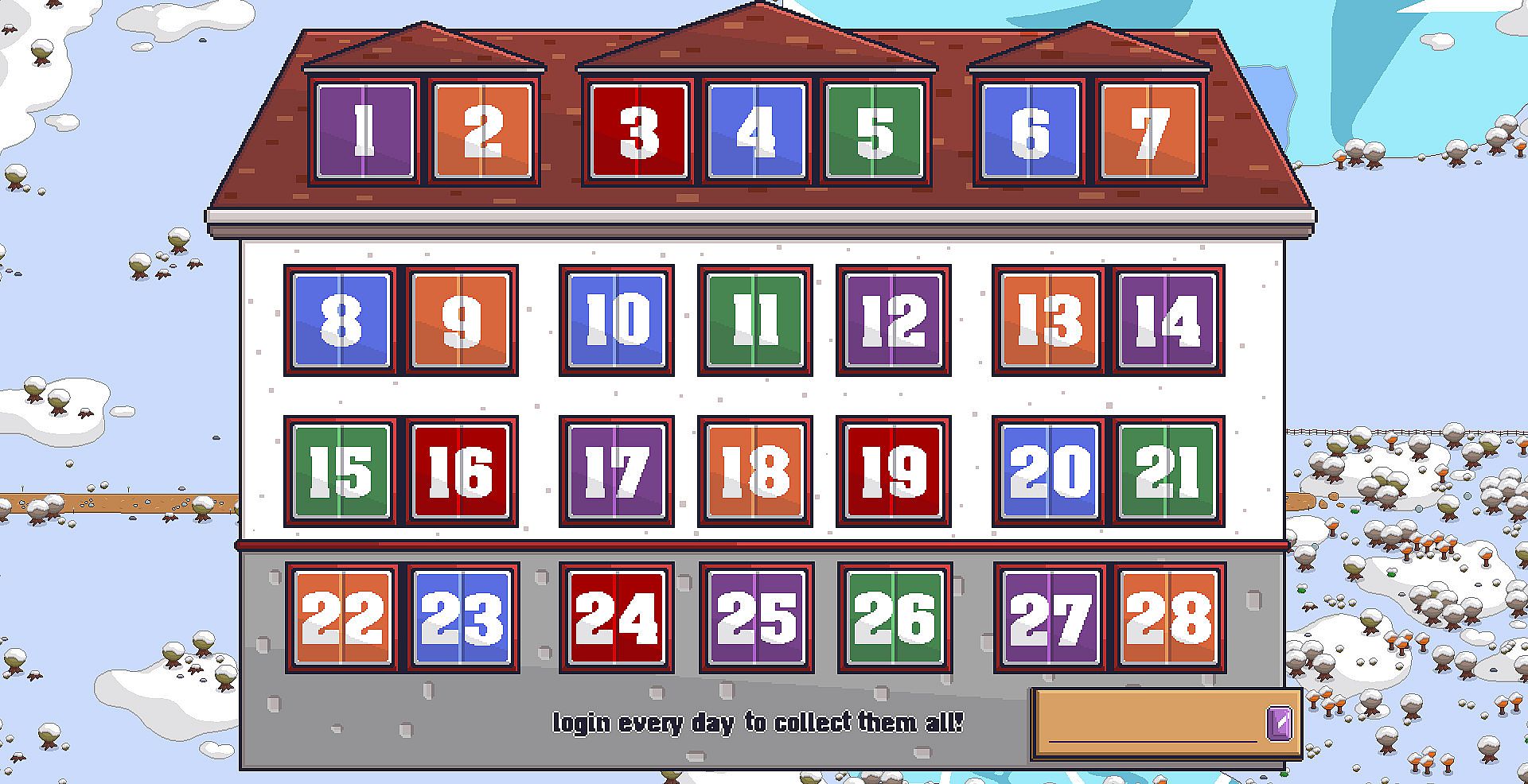- Access to the Advent Calendar. Once a day you'll be able to open the next day and receive 50 gems.