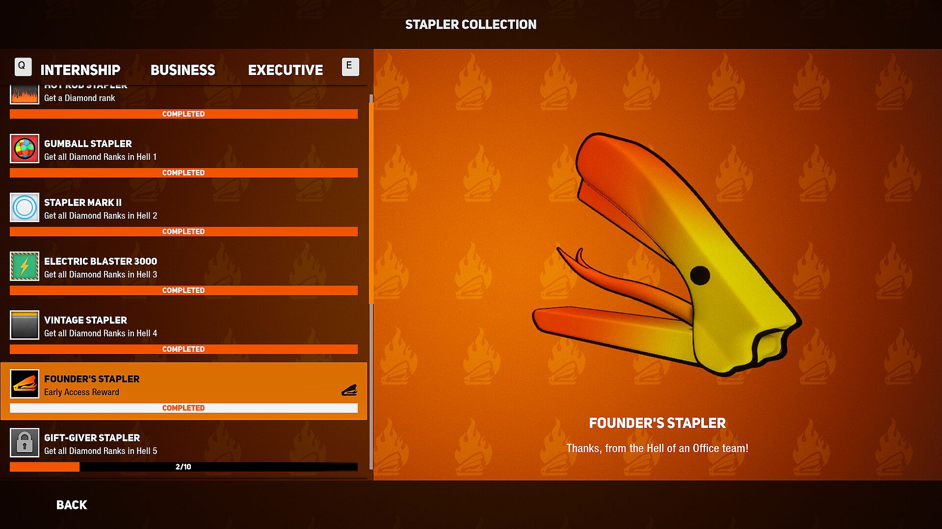 Founder's Stapler Skin: "Executive" Stapler Skin, celebrating the support of the Early Access Players. Obtained by purchasing Hell of an Office.