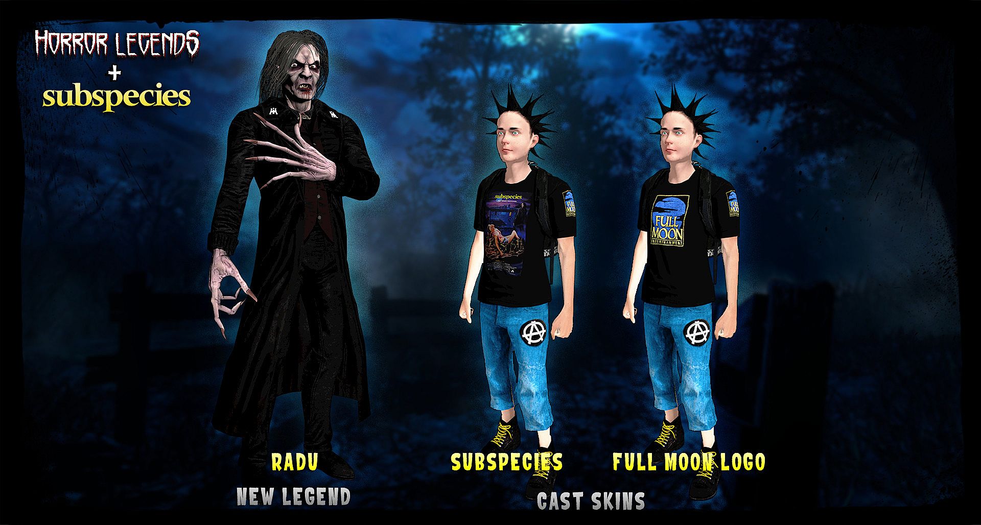 Radu Vladislas from Full Moon Features’ “Subspecies” descends upon the world of Horror Legends. Includes over 20 new unlockable skins and 2 new playable characters with brand new abilities.