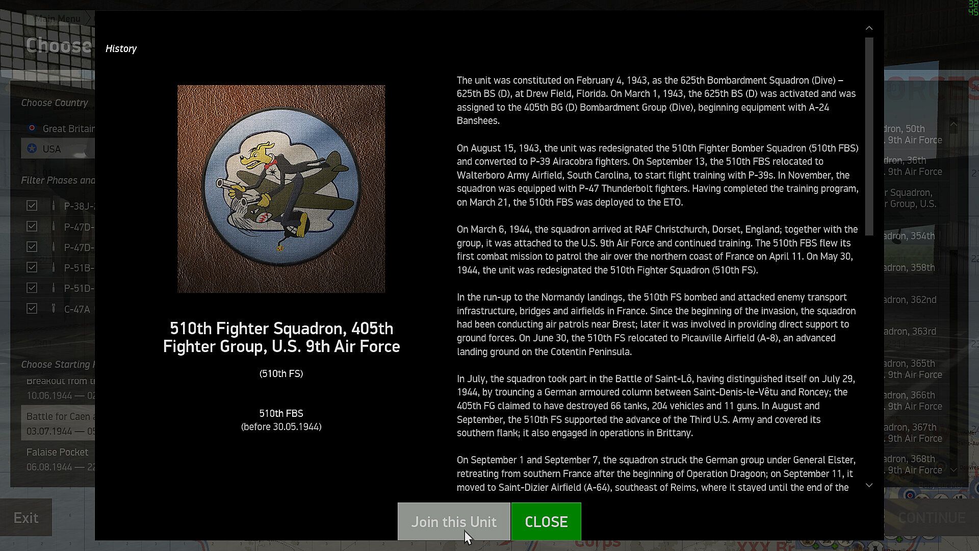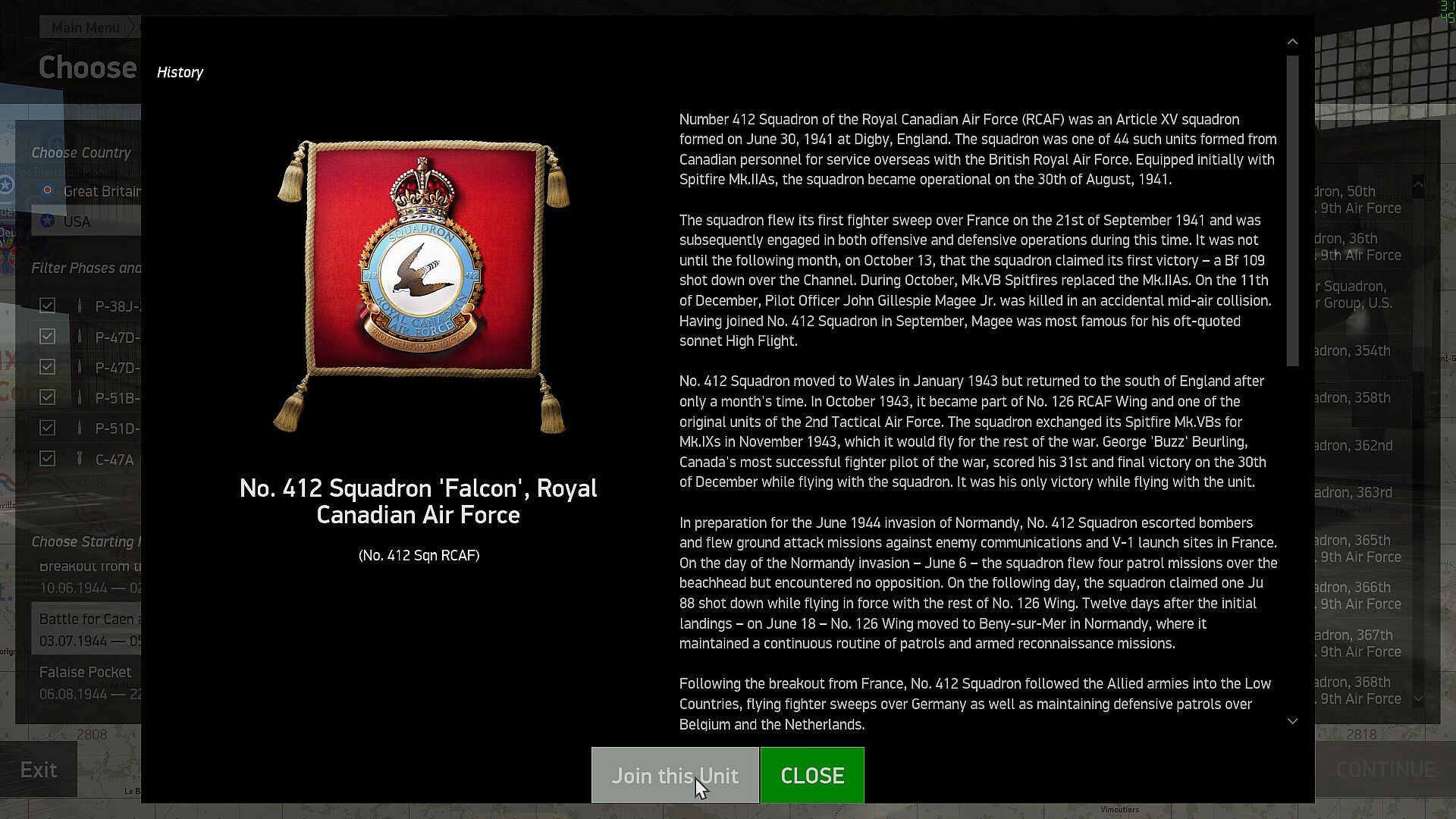 Another step forward in complexity is the Career mode: here you can join one of more than 100 historical American, British or German squadrons and complete missions day by day, earning awards and rising in rank - after becoming a commanding officer you can direct your subordinates and alter the mission plan. Mission types change and represent the real missions this squadron was performing on this day. The frontline shifts and the weather changes according to history, ground forces capture or lose airfields and squadrons fly rebase missions. You can even can ask to be transferred to another unit or read a newspaper with news articles of the time.