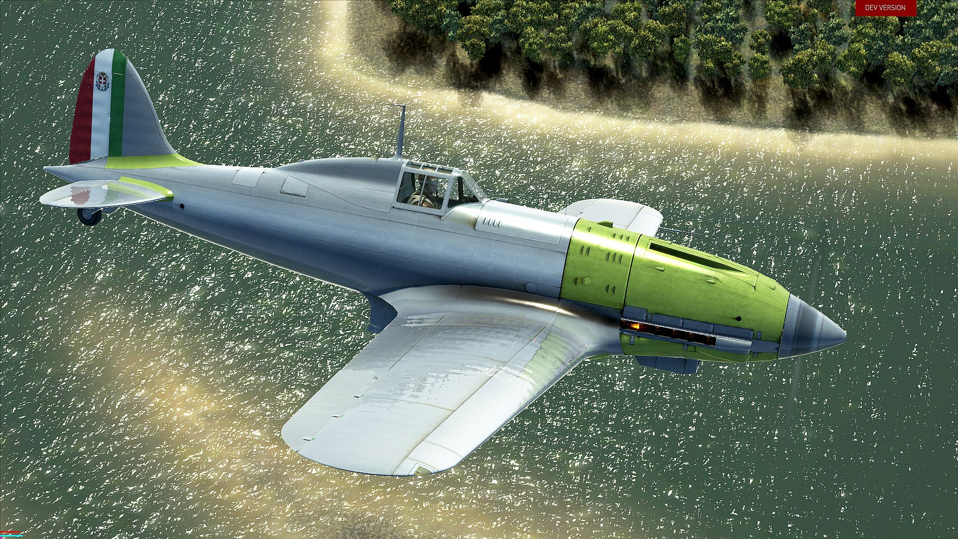 The engine is an export version of the DB601A that was also used in earlier Bf-109 models. But unlike the Bf-109s in our game, this one doesn’t have a good automated constant-speed propeller mechanism. The Macchi’s propeller only has two basic positions: 2200 and 2400 rpm. All other modes are up to the pilot to set up and maintain by controlling the prop pitch manually. Water and oil radiator controls are manual as well. Keep in mind that Macchi’s throttle movement is also inverted – forward to slow down and back to accelerate.
