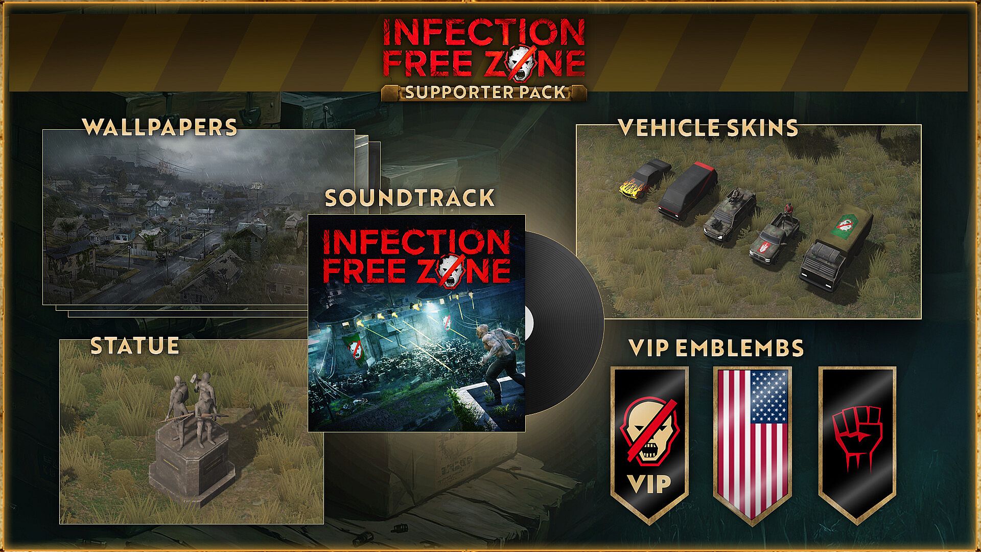 This DLC Package helps finance the production of Infection Free Zone. It's not mandatory to play the Infection Free Zone and offers only cosmetic and out-of-game items. Still, we hope that the content of the Supporter Pack will bring joy to our most dedicated fans. Thank you for being with us!