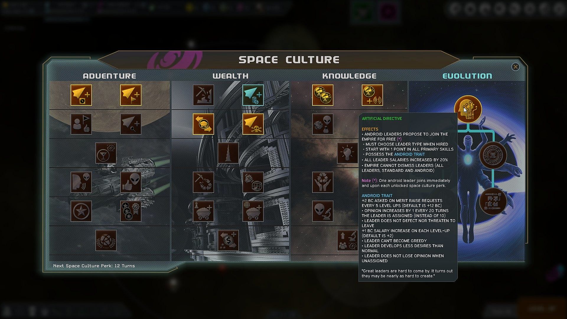 Evolutions provide unique, thematic, and highly asymmetric space culture trees custom tailored to fit every race in the game. With many game altering multipart perks to unlock, divergent paths to take, and randomization possibilities to explore, there’s no shortage of exciting new strategies to experience. As new doors open, others may close, as taking the reins of your empire will have you facing tough strategic decisions as you determine how best to evolve it.