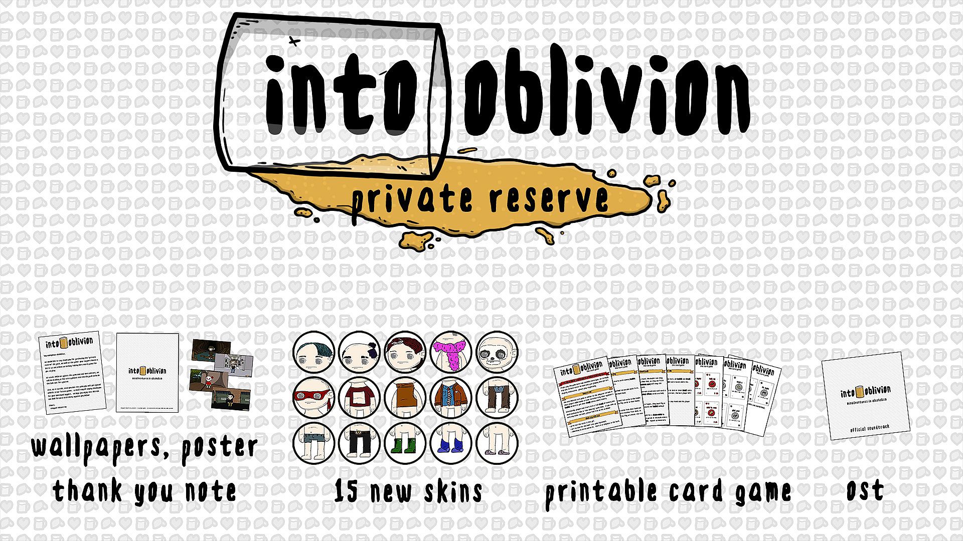The Into Oblivion - Private Reserve DLC contains such goodies as new skins for the game, the soundtrack, wallpapers, printable card game for home play, and more. As we release content updates for the game, we will pack more things in too.