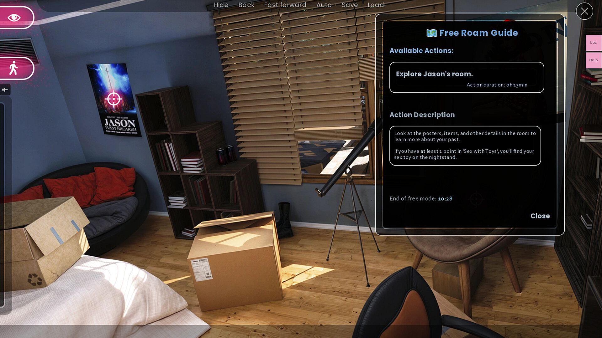 • in free roam: a list of available main actions, their duration, and their potential impact on the story ahead.