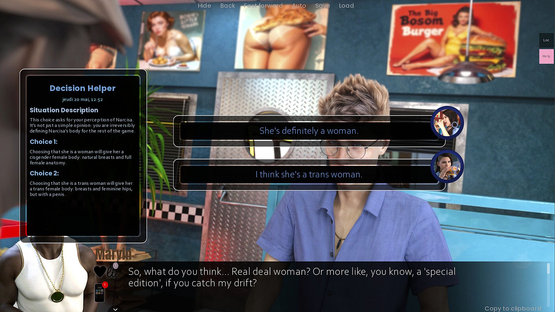 • Choice Aid: during key decisions or in free roam phases, a button allows you to open an information window. It provides: