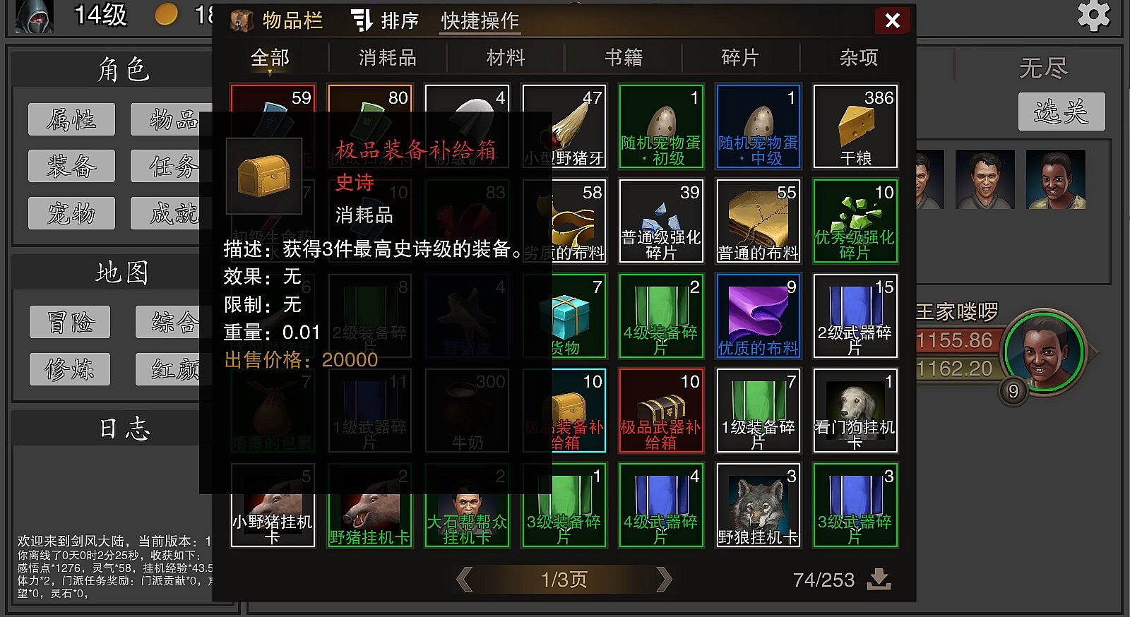 解锁进阶包后,每个存档都可以使用一次额外补给,可提高你的初始游戏体验。每个存档都可以使用一次额外补给,会获得副本扫荡卡*40,挑战扫荡卡*40,合约刷新卡*6,40万金钱,100神石,牛奶*200,极品装备补给箱*4,极品武器补给箱*4