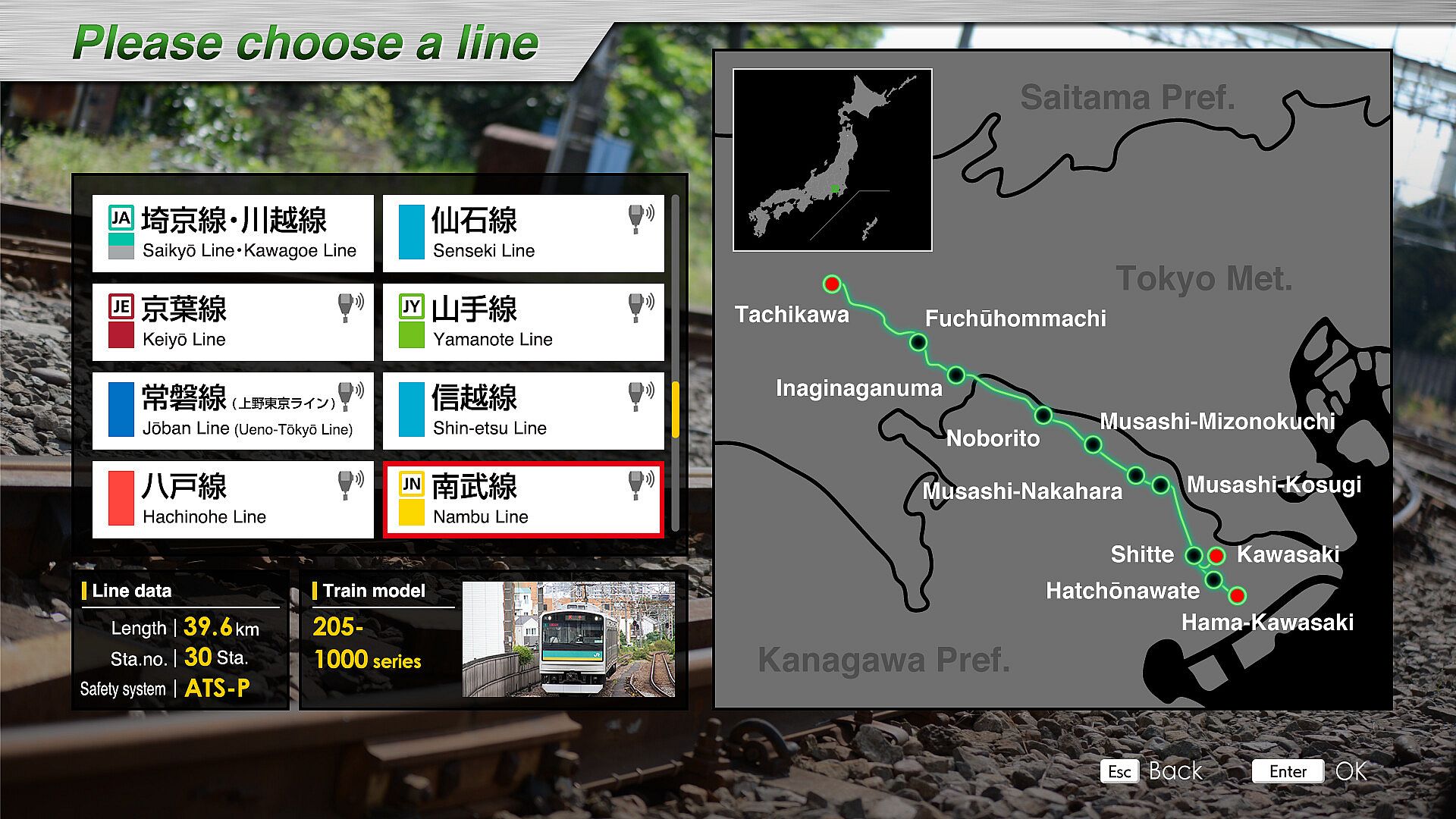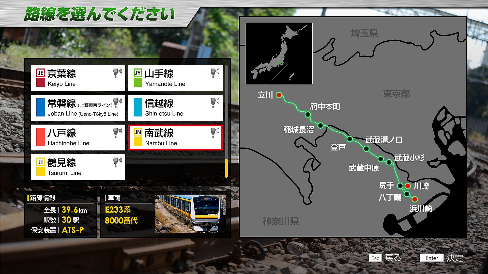 The Nambu Line is a 35.5 km long line connecting Kawasaki Station in Kawasaki City, Kanagawa Prefecture and Tachikawa Station in Tachikawa City, Tokyo.The predecessor of the Nambu Line was a private railroad company, Nambu Railway, which opened between Kawasaki Station and Noborito Station in 1927 for the purpose of transporting gravel from the Tama River. Later, in 1929, the entire line between Kawasaki and Tachikawa Stations, in its present form, was opened.