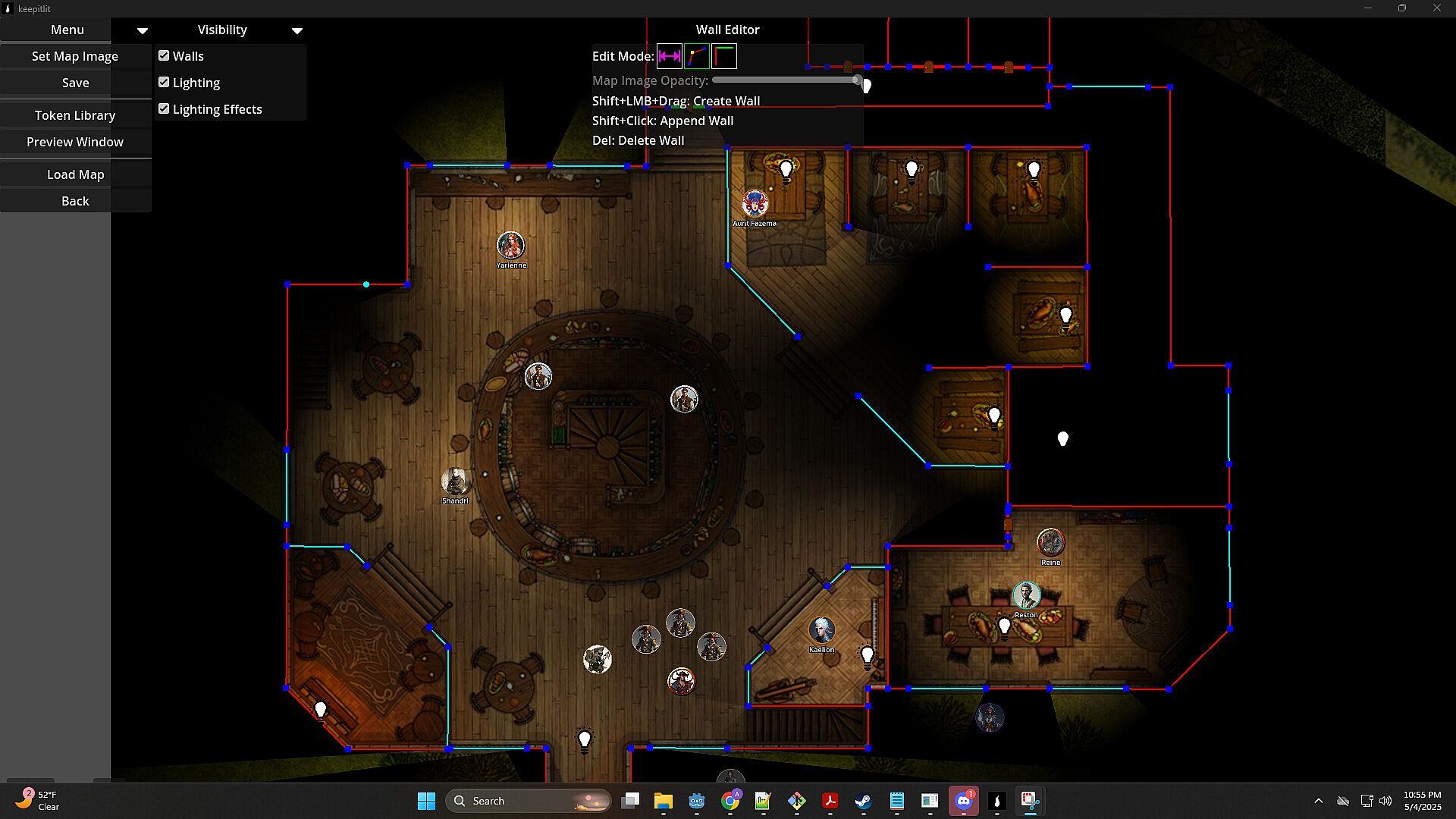 Customized environments with light obstructions, doors, tokens, lights, illusionary walls, and transparent walls