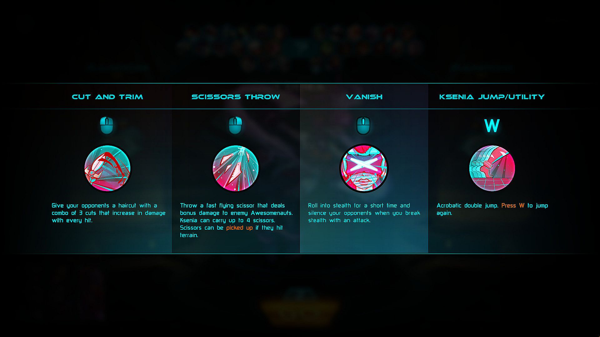 • Throw fast flying scissors that deal bonus damage to enemy Awesomenauts based on their maximum health.