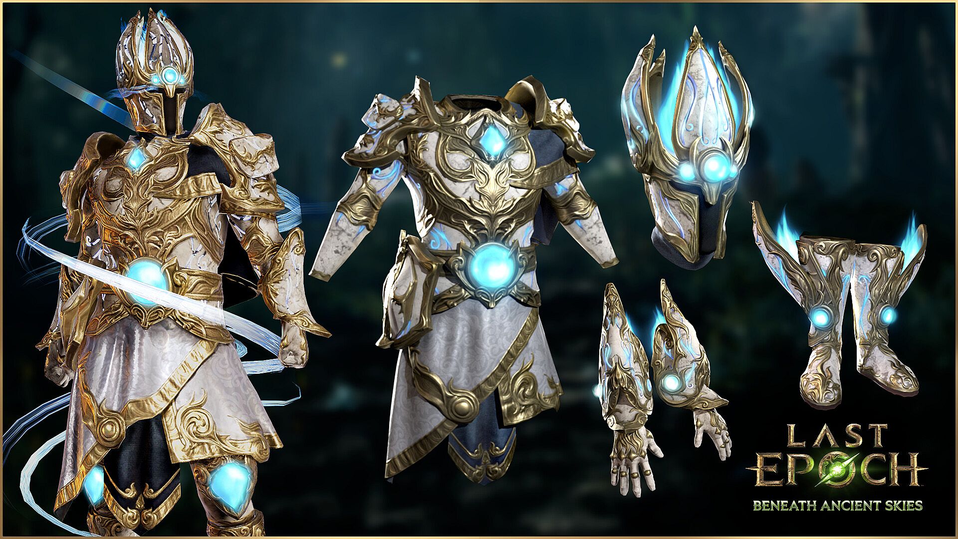 Adorned in ceremonial white and trimmed in glowing blue, this armor once belonged to the sworn protectors of Eterra's sacred halls. Regal and radiant, it honors strength not just in combat—but in restraint.