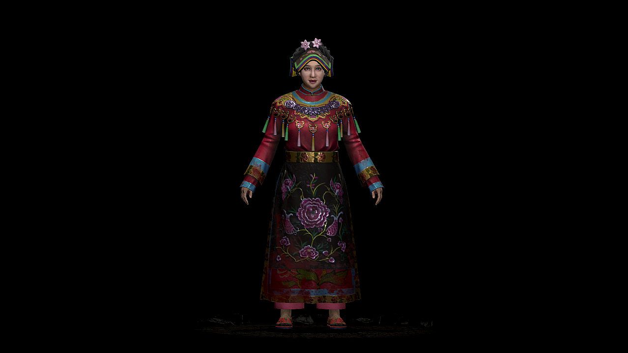 红色袍裙上绣有绽放的花朵,襟边袖口都扎有花边,族中女子最偏爱的红色,代表着对春暖花开的期盼。秀水云舟