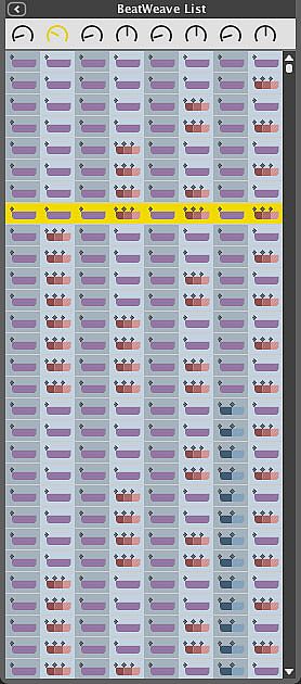 The BeatWeave List shows every possible combination of your chosen note clusters in one bar. Each one of these patterns can be inserted into the Arranger.