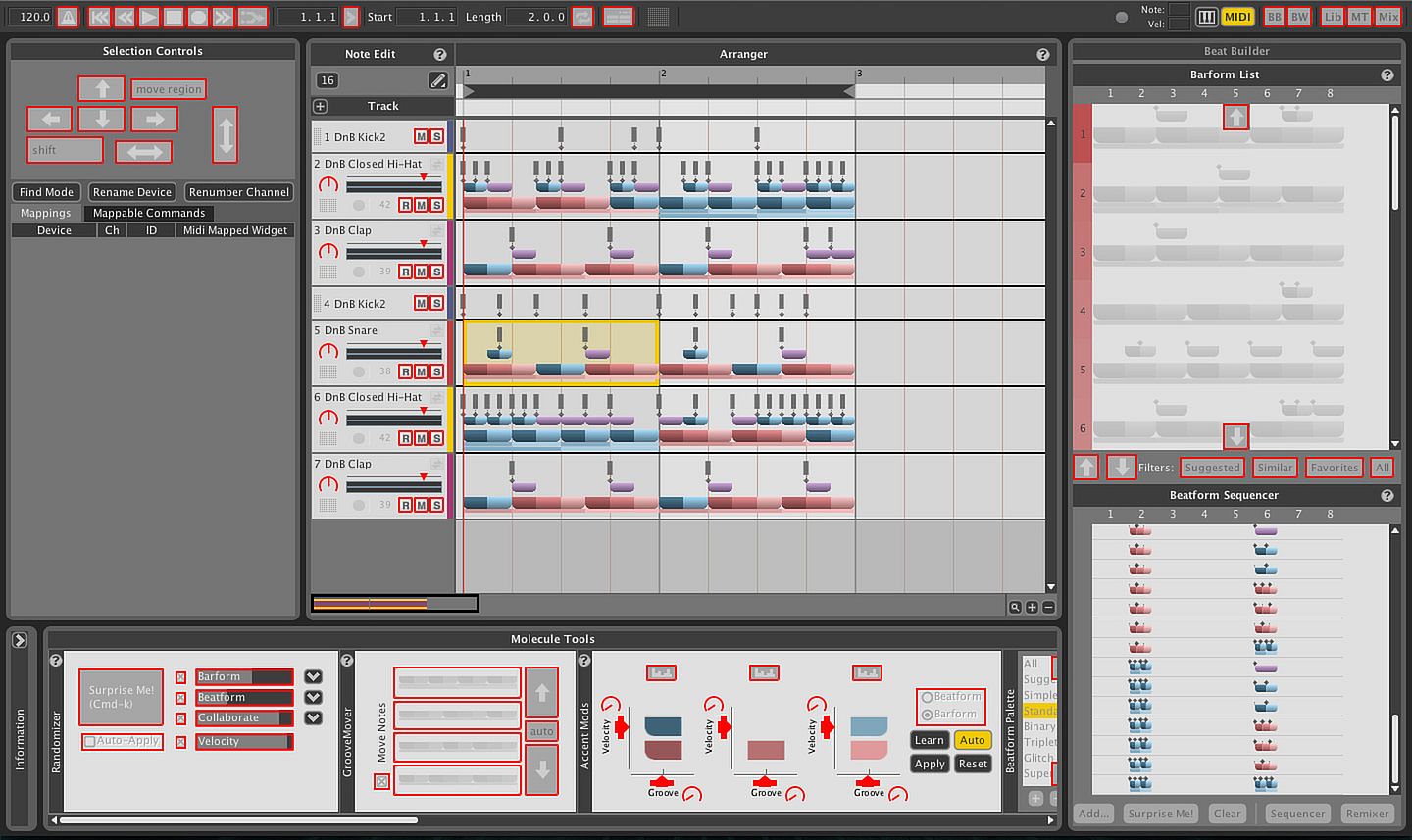 These dials are designed to tumble through the BeatForms in the BeatForm Palette and spread the love through your beat. Select different entries in the BeatForm Palette to change what you can dial into the selected regions based on either color codes or the beat locations. Complexify or simplify your beat.
