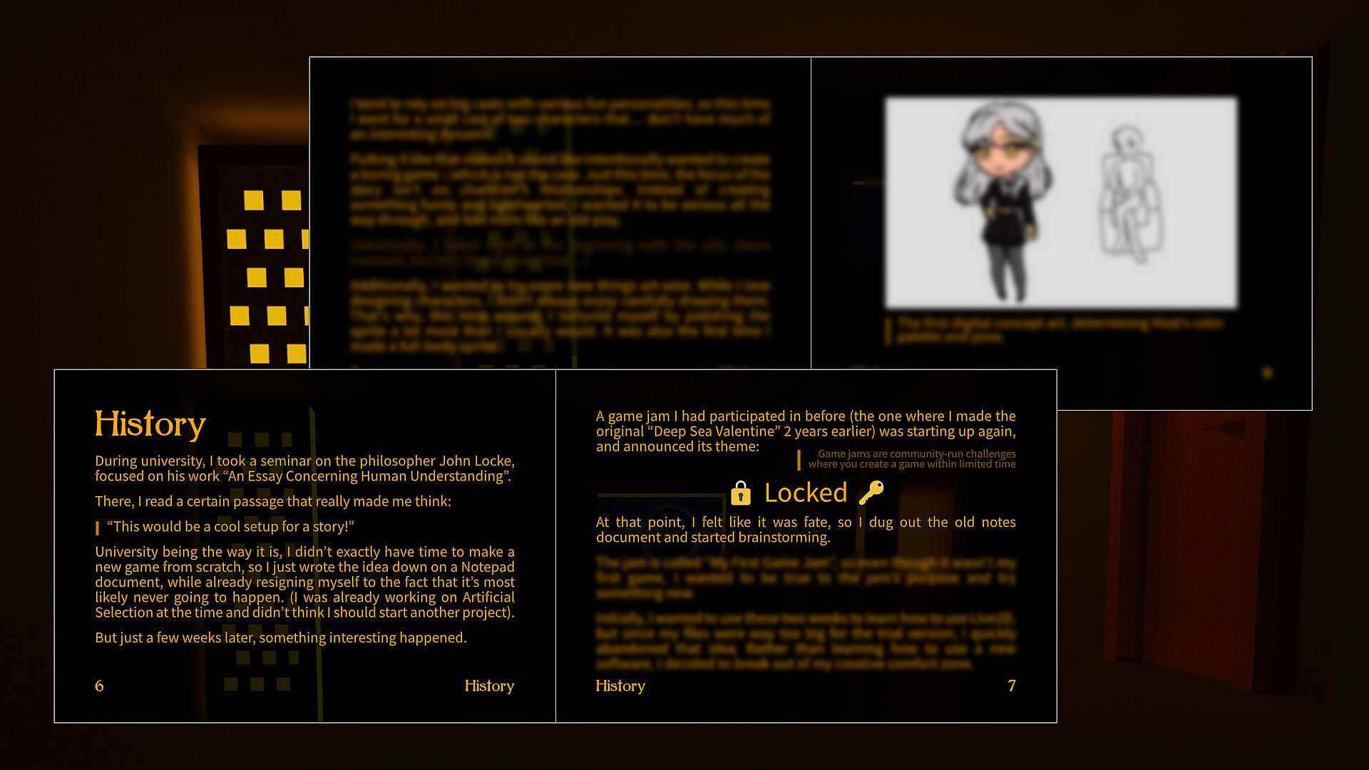 This is the development & art book for Locke(d), containing over 40 pages of background information, creator commentary, concept art, philosophical discussions, FAQs, and more!