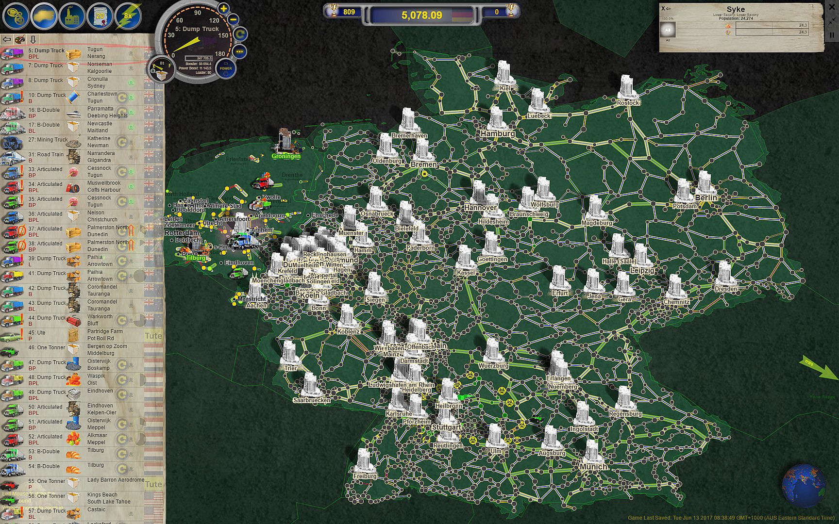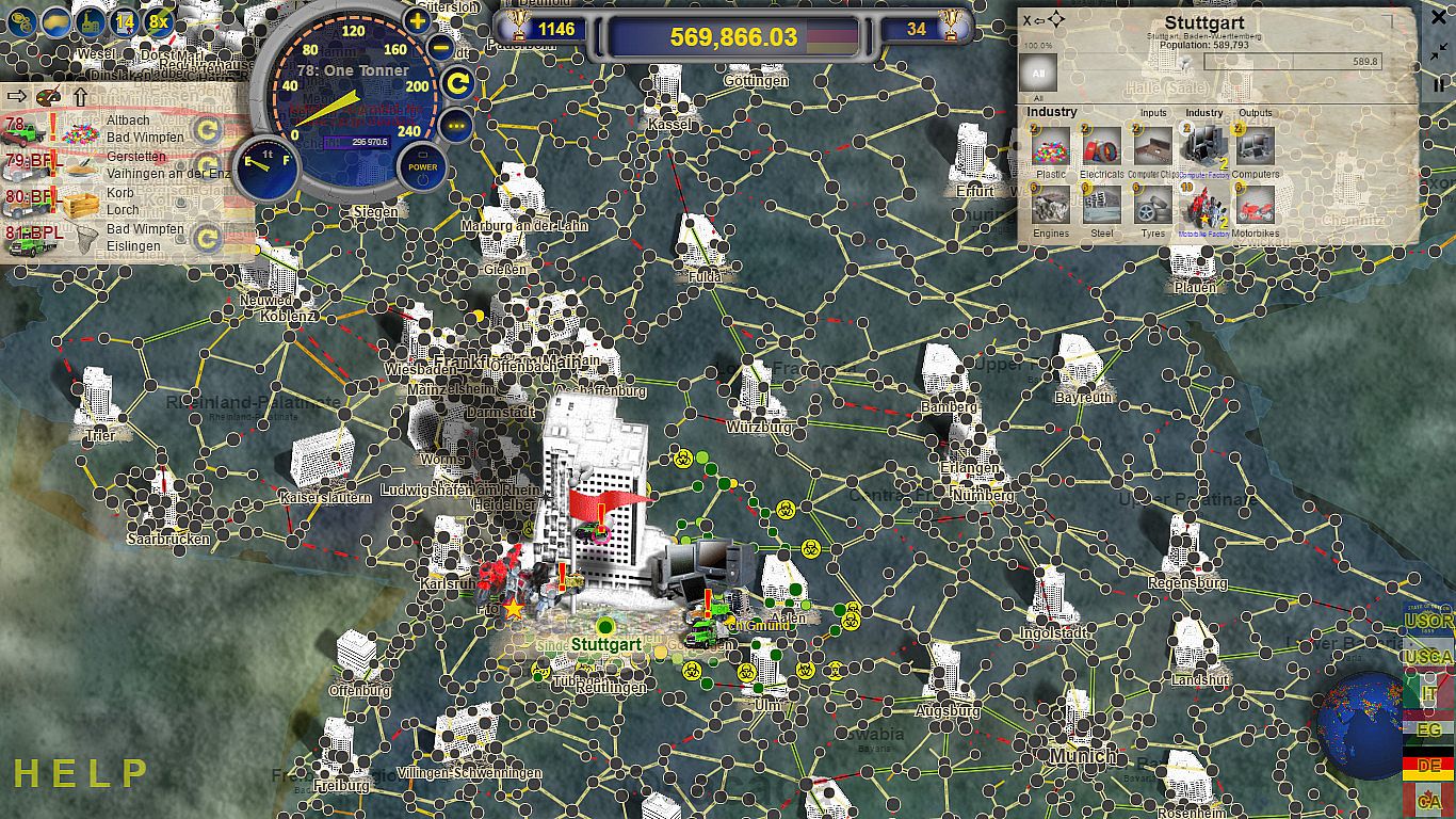 A Large Chemical Spill in the Stuttgart region has created chaos. A full quarantine of ALL products in and out of the Stuttgart region has been put into place. Over 100 towns are within the affected zone. We can get you into the area so you can fix the towns within the zone, and you can move your empty trucks in and out. Small industries have been setup for each type of product within the zone.