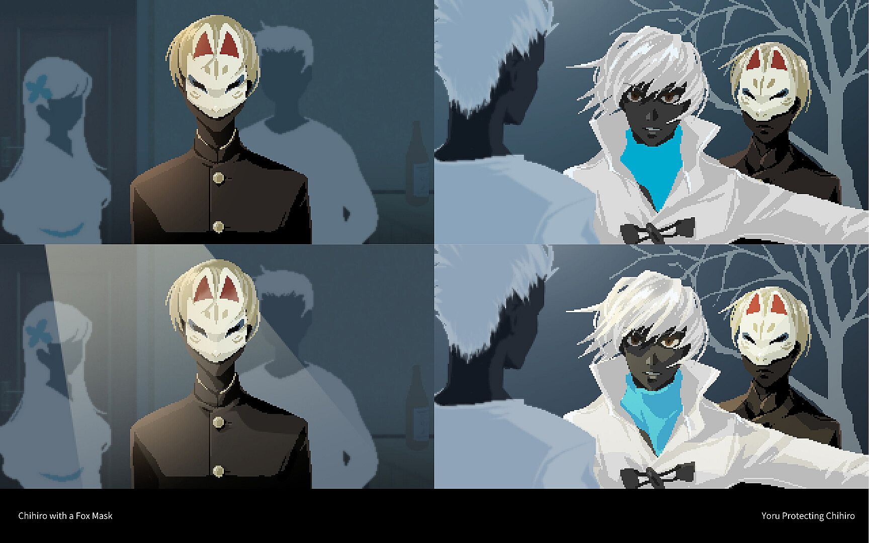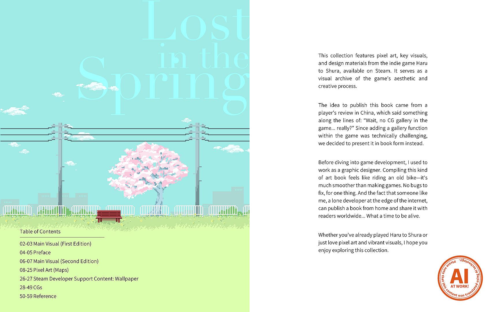 The "Lost in the Spring - Art Book" is a visual collection of pixel art and visuals created for the indie game Haru to Shura. This book focuses on the beautifully crafted pixel art backgrounds, CGs, and main visuals that define the game's atmosphere.