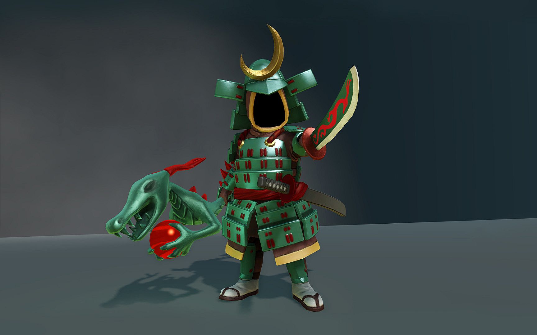 A Gusoku Robe in Green, Red and Black, a Jade Dragon Staff and a razor sharp Jade Blade.