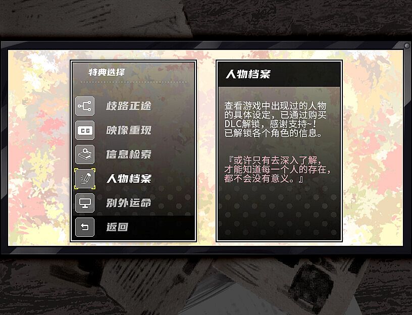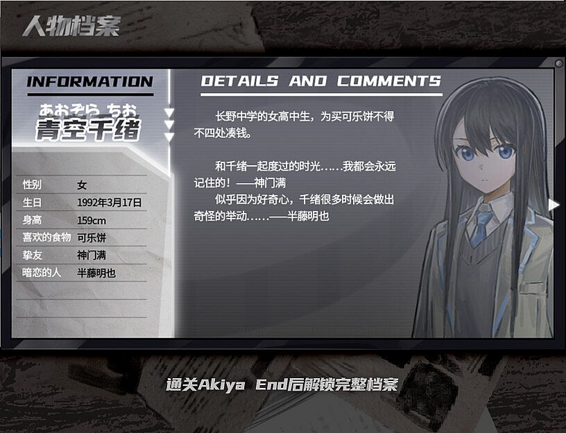 • 角色设定集:内置于游戏中,可通过标题页面的“特典-人物档案”进入。在通关Akiya End后才会解锁所有角色的设定信息,并且同样推荐通关全部结局后再了解角色设定。