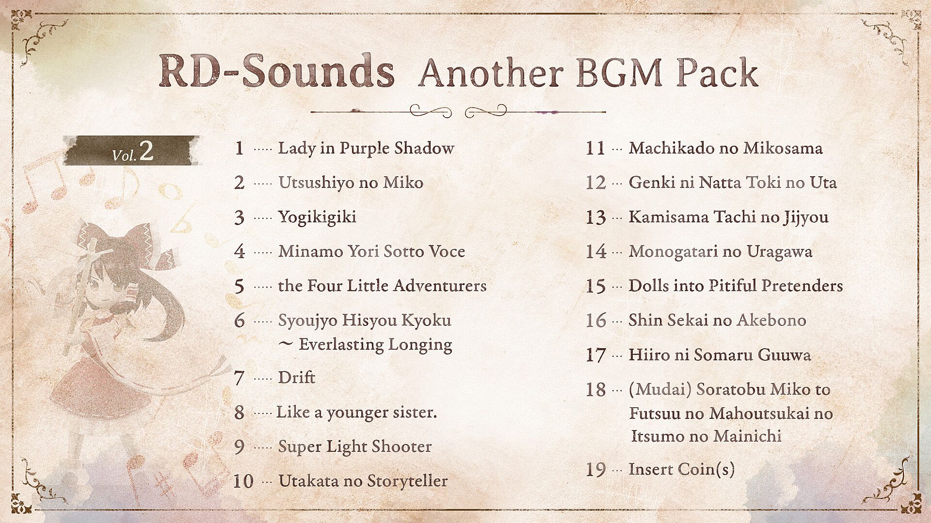 This is an expansion pack that replaces the in-game music of Marisa of Liartop Mountain with the tracks listed below.