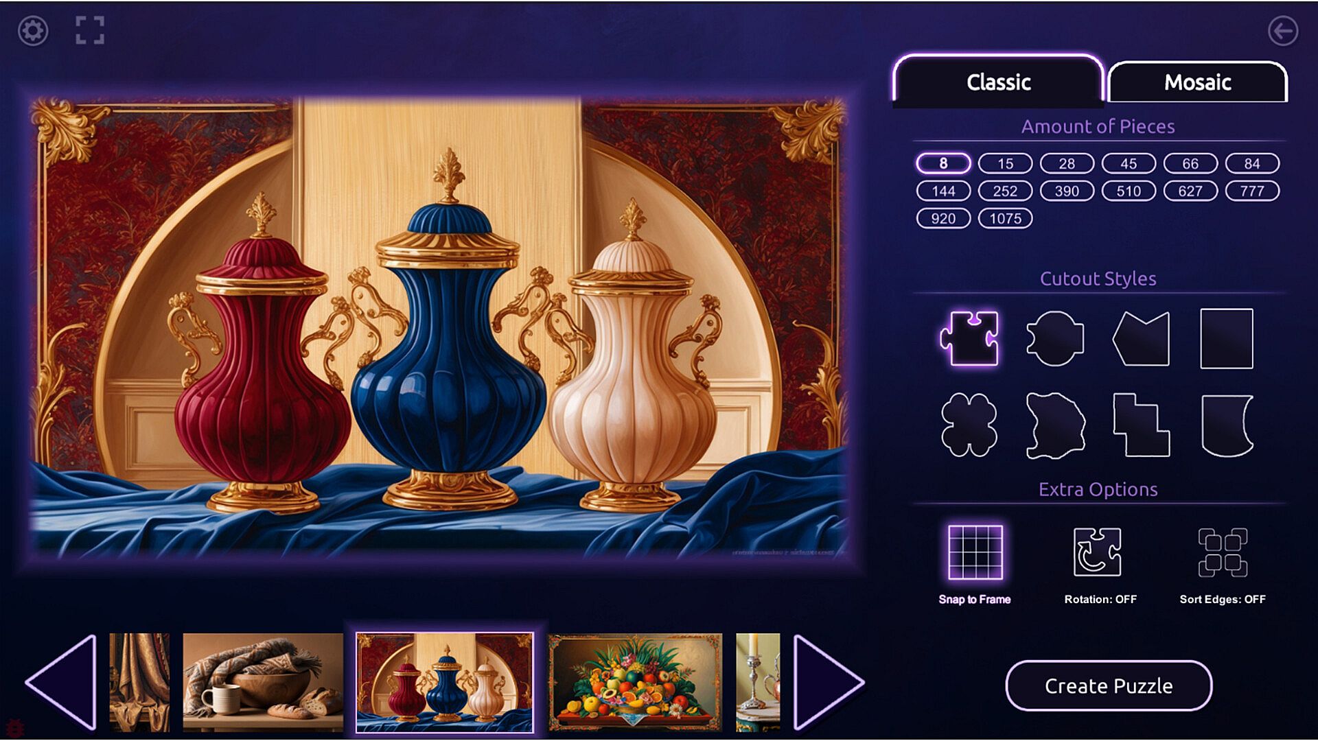 This collection of 51 Still Life puzzles offers a unique exploration of everyday objects and compositions from around the world. Fruits, flowers, household items, artwork, and handcrafted artifacts highlight the connection between the mundane and the symbolic in various cultural contexts.