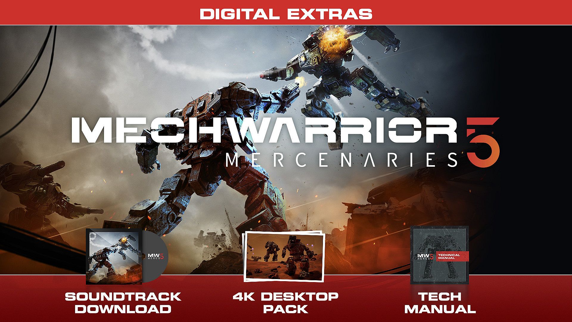 Digital Extras content includes the MW5: Mercenaries Soundtrack consisting of 25 tracks & the Heroes of the Inner Sphere Soundtrack with 14  tracks. The Digital Extras content also includes a selection of hi-res artwork and renders for desktop & mobile and a 58-page Tech Manual outlining Mech stats.