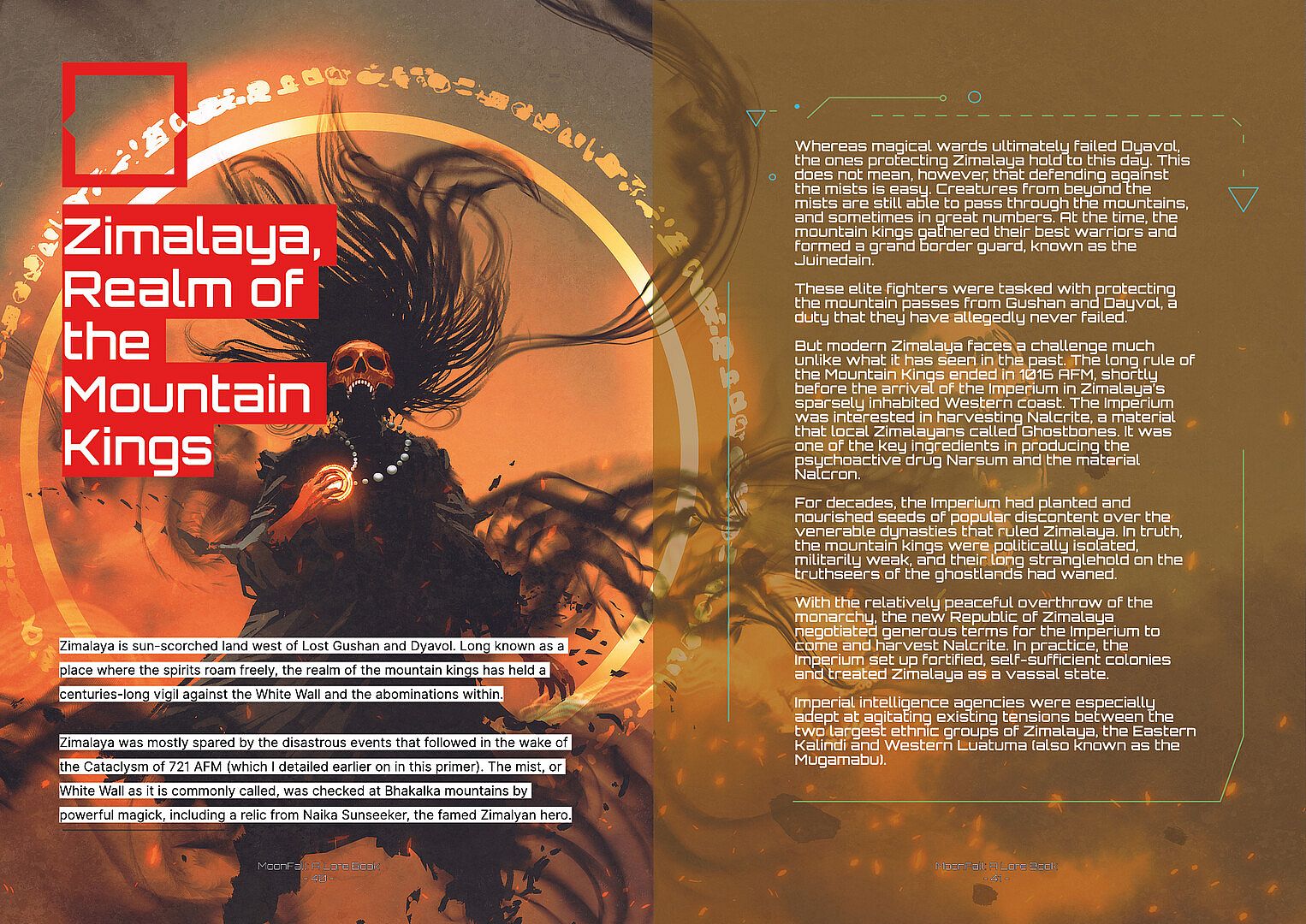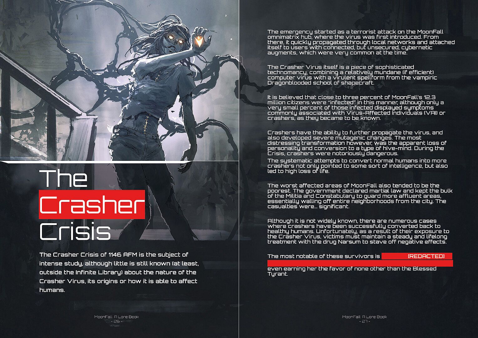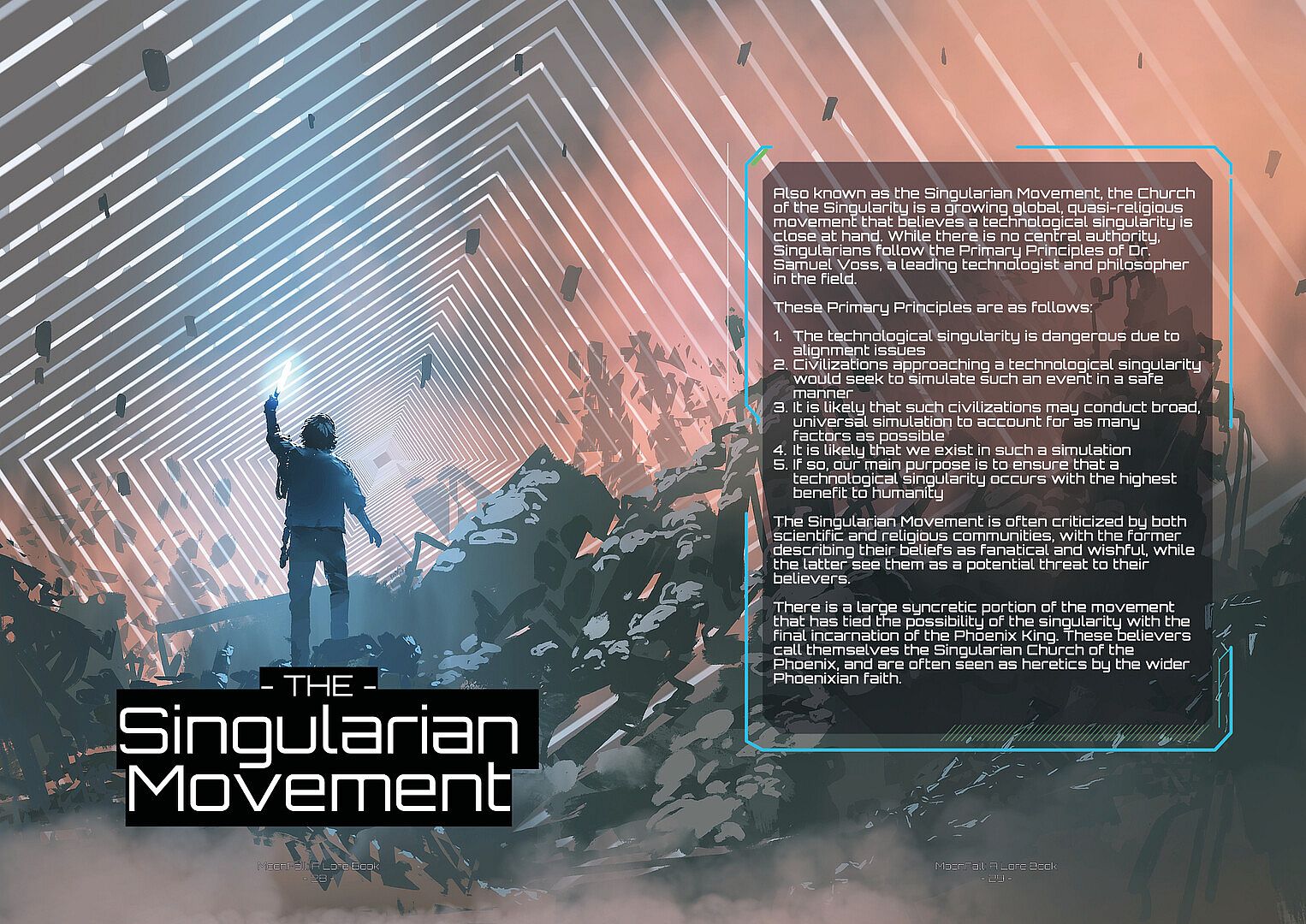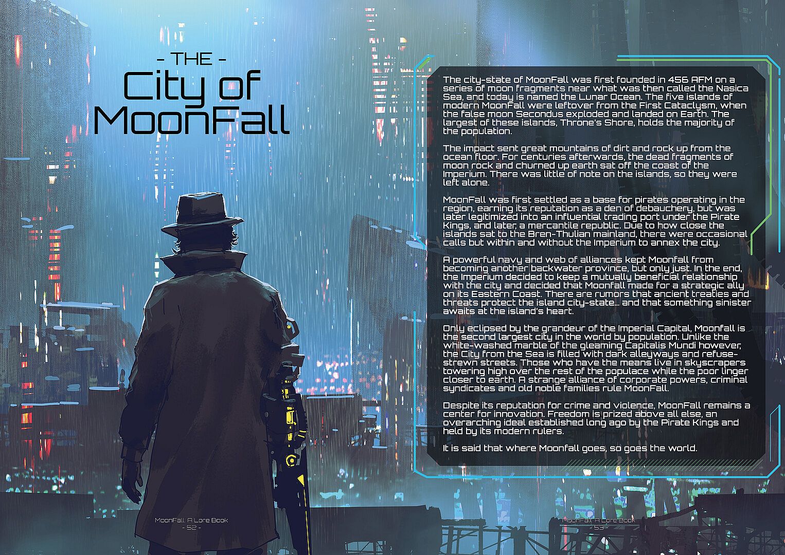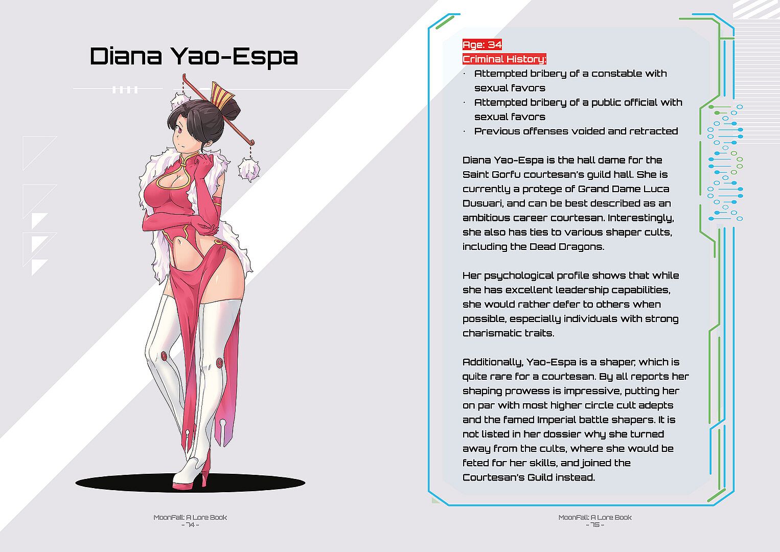 This book is meant to be supplemental material that expands on the in-game lore for the A Memory of Eternity series. Written in-universe by Raguel Drusus, Assistant Curator of the Infinite Library, MoonFall: A Lore Book covers the essential topics, global powers and the dramatis personae that can be found in MoonFall.