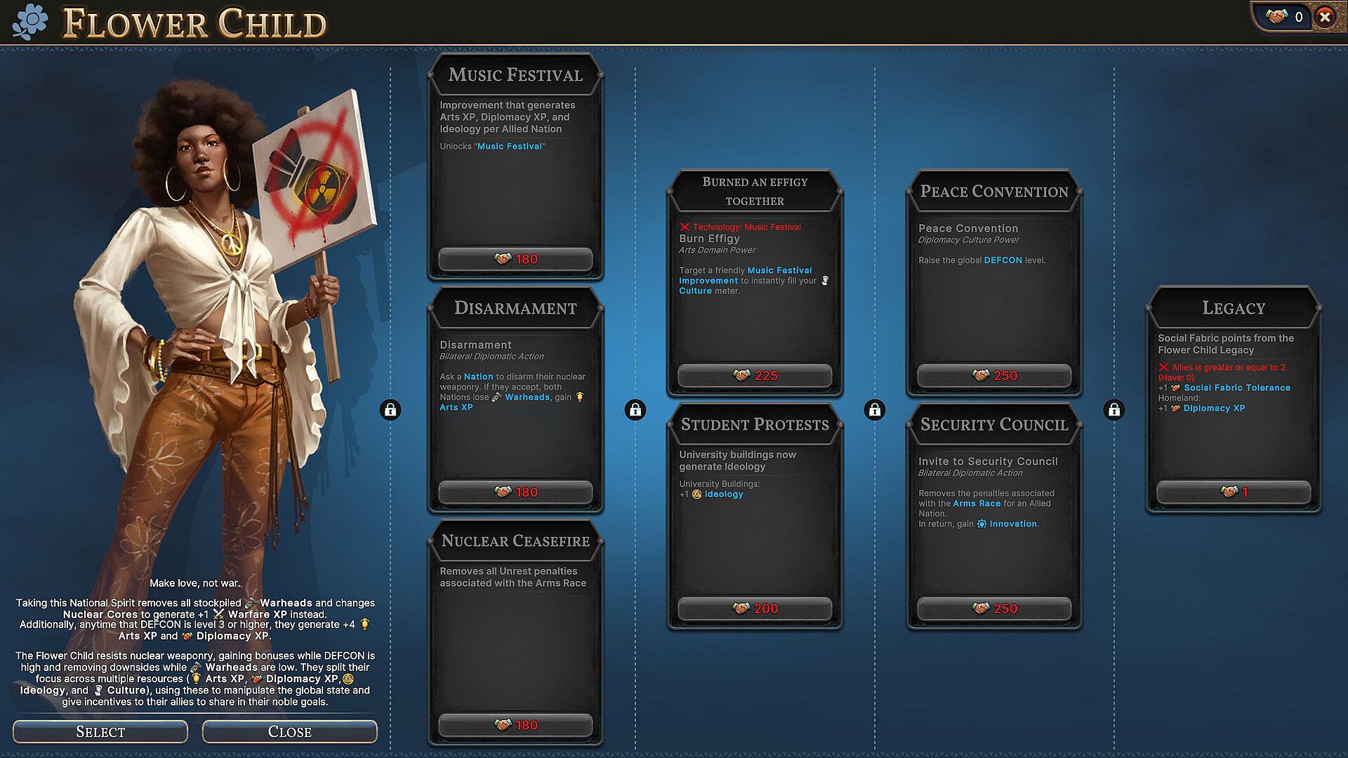 • Three New National Spirits: Take full advantage of the new Strategic Warfare system early through the Siege Master National Spirit, which focuses on building siege weapons like Ballistae and Siege Towers. The Nuclear Superiority National Spirit gives you tools to dominate militarily during the Arms Race. The Flower Child National Spirit allows you to try to oppose nuclear weapons and bring the world to its senses before things get out of hand.
