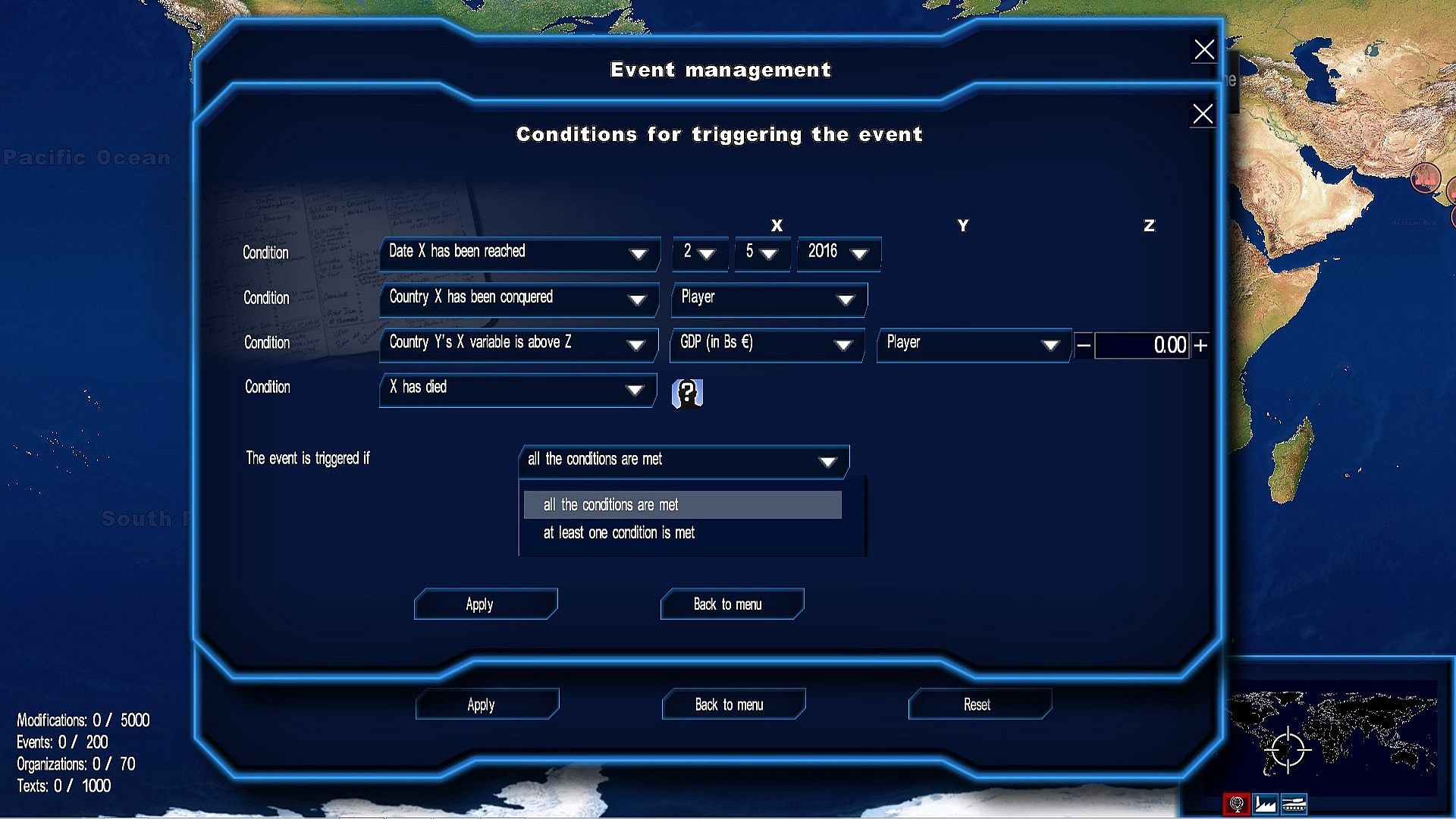 • create new missions and scenarios that are highly developed and detailed (triggering protests, wars, disasters, political scandals, assassinations, national elections, character demands... with the option of defining several conditions for triggering these events, and editing game text...)