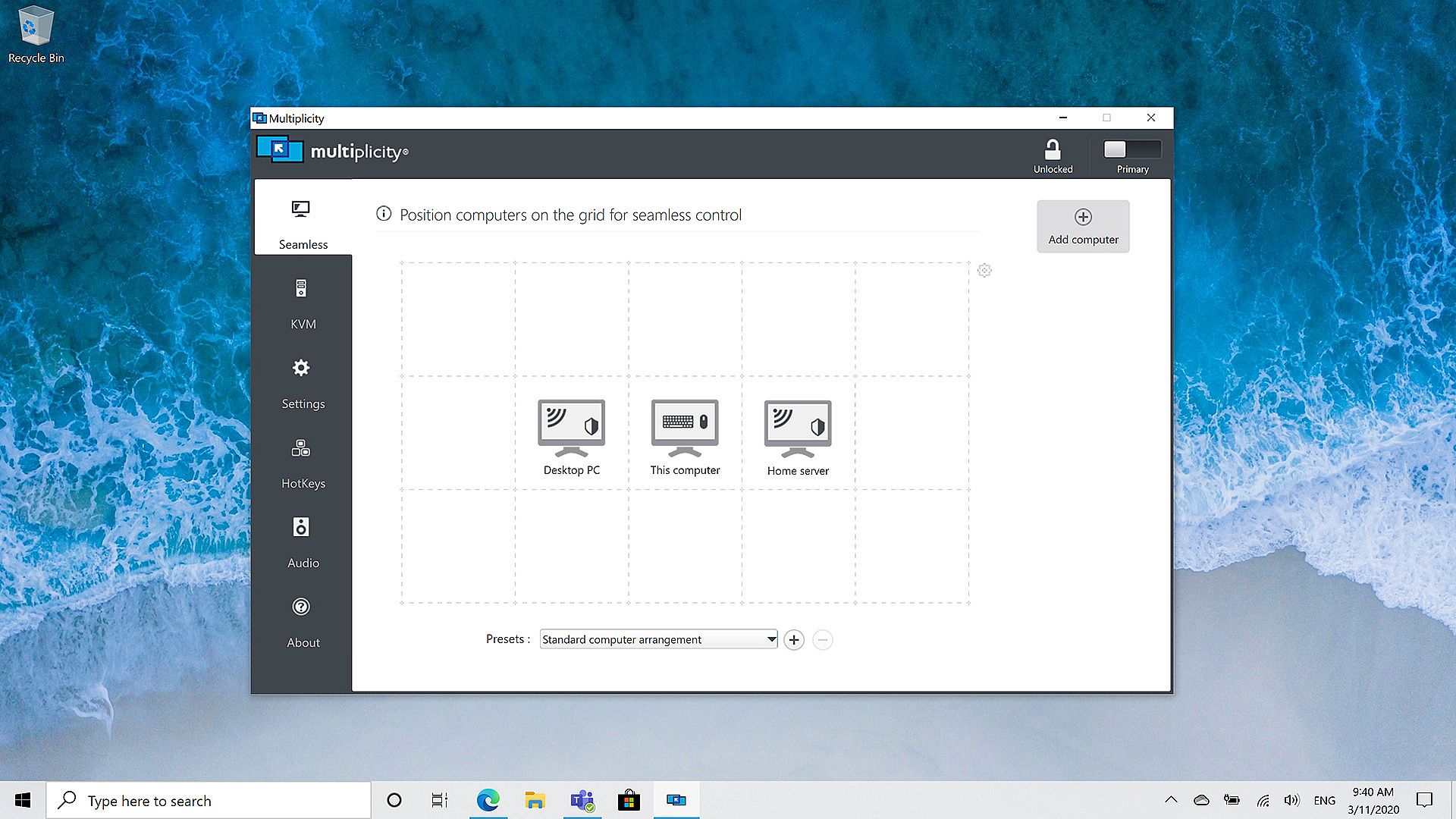 If you are on the go and remoting into other PCs, or simply require the power of a seamless connection of up to 9 machines, Multiplicity KVM is the best application to get the job done. You can lock and unlock all of your PCs at once from one keyboard, listen to audio from multiple PCs without having to switch headsets and speakers, and drag and drop files and folders of any size between PCs.