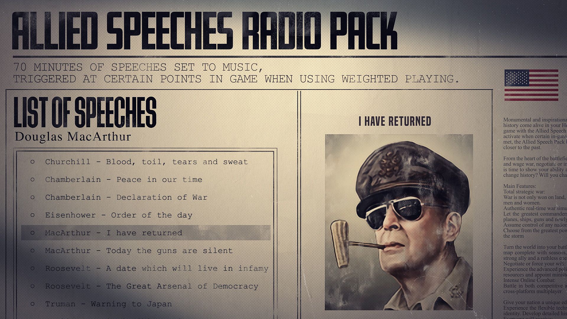 Monumental and inspirational moments from history come alive in your Hearts of Iron IV game with the Allied Speech Pack. Set to activate when certain in-game conditions are met, the Allied Speech Pack brings you closer to the past.
