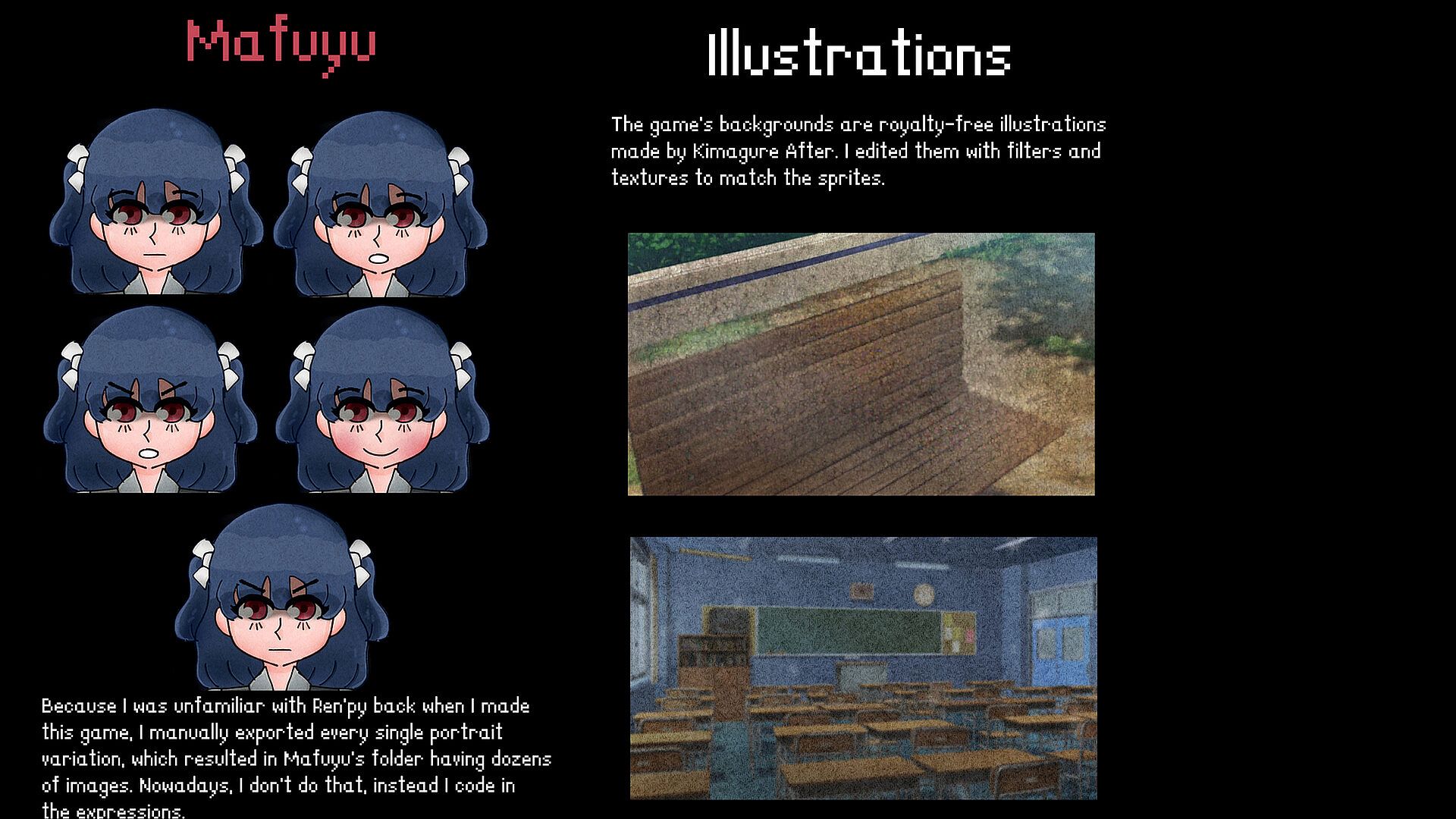 You can print out the artbook yourself for personal use, to put it in your room, show your friends, etc. But please do not sell it, physically or digital - I already have a tough time making any money at all from my creations, and it would be really upsetting. I'm a solo dev with zero investors or anyone backing me up financially.
