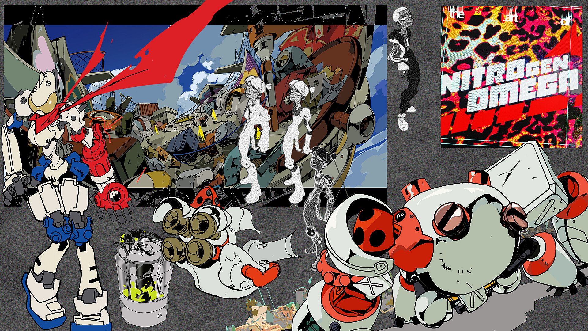Dive into the crazy concept art behind the world of NITRO GEN OMEGA, featuring released and unreleased enemies, mechs, locations, characters and more.