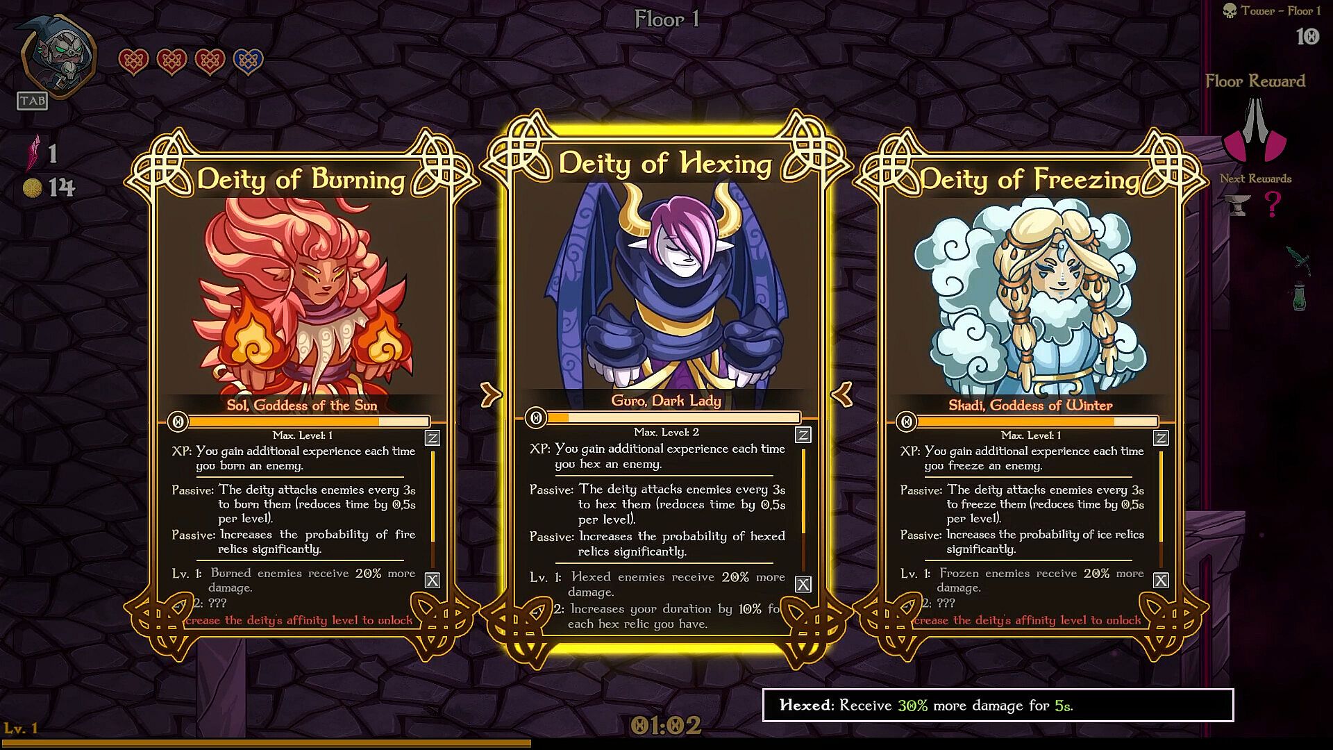 You will be gifted by a deity of your choice to improve your runs substantially. Let’s say you choose Sol, the fire deity. This means, the probability of fire relics will drastically increase, so synergies will be more available.