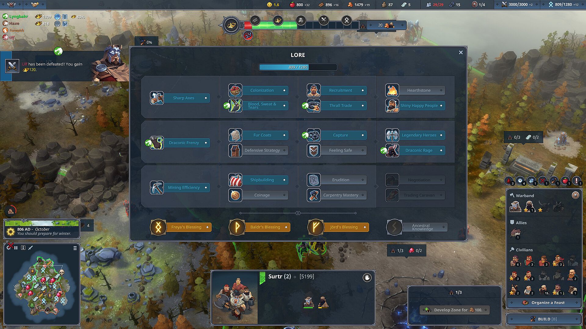 - You start with thralls, which collect food and can be assigned to buildings to increase the workers production.
