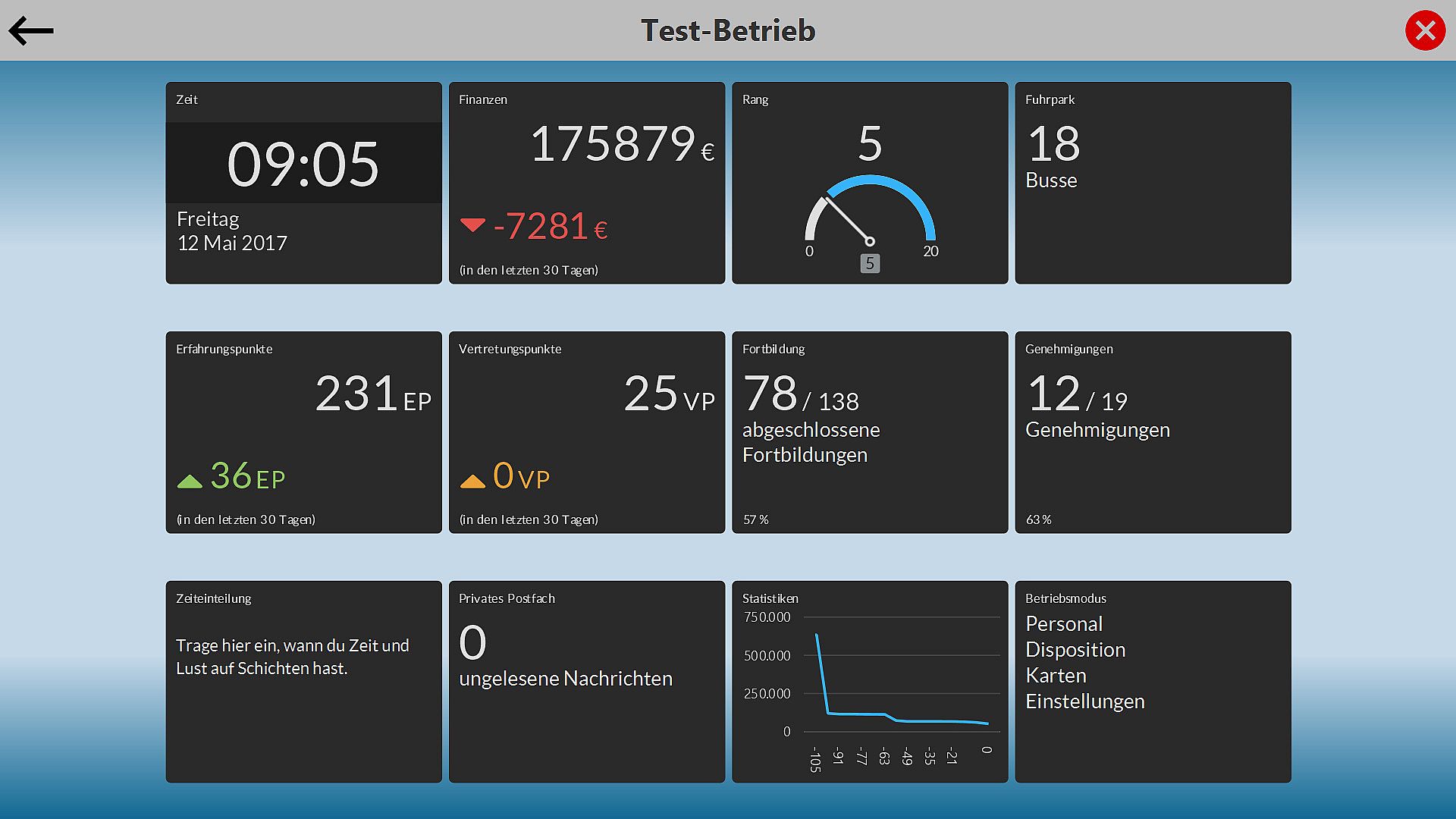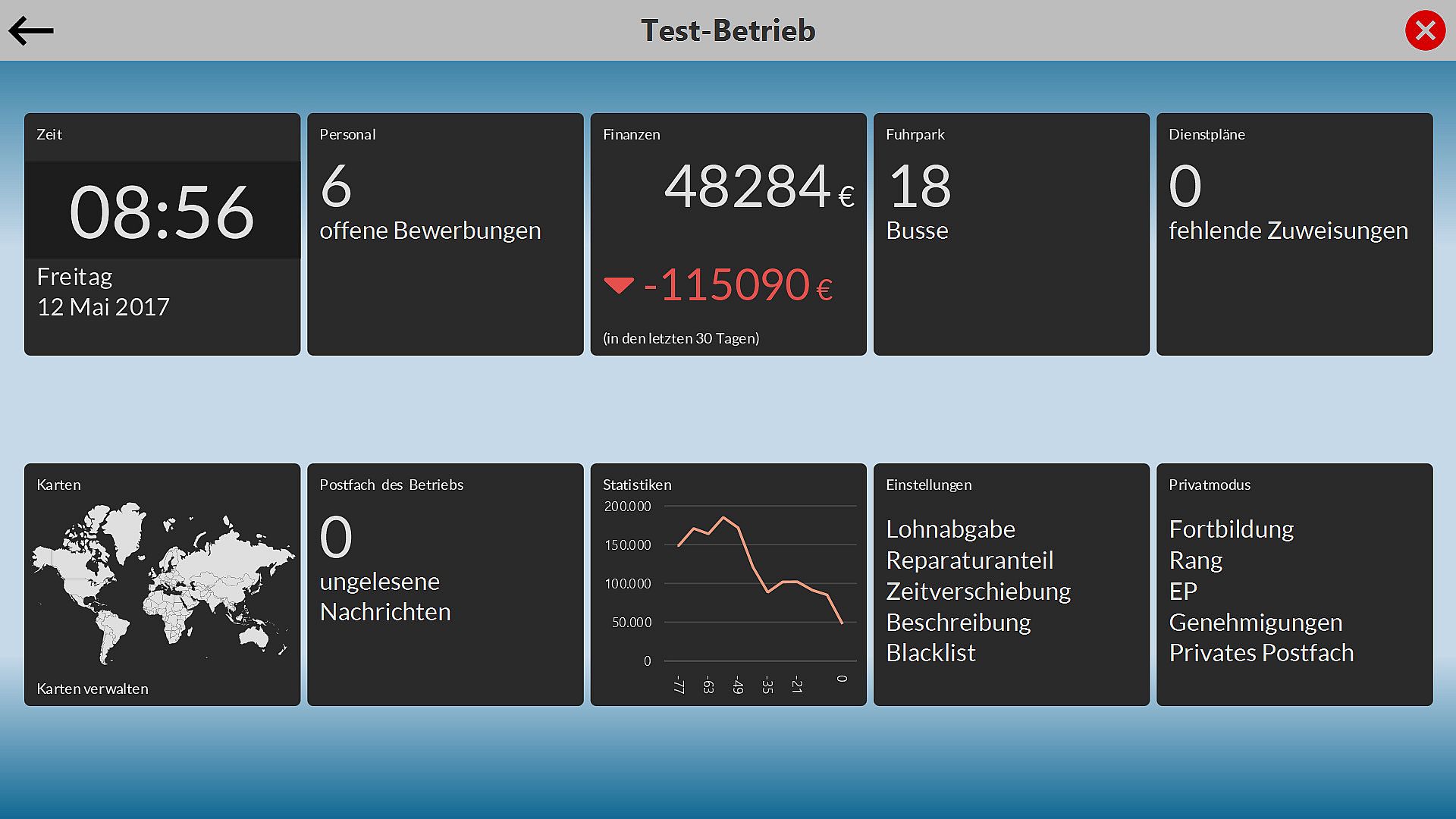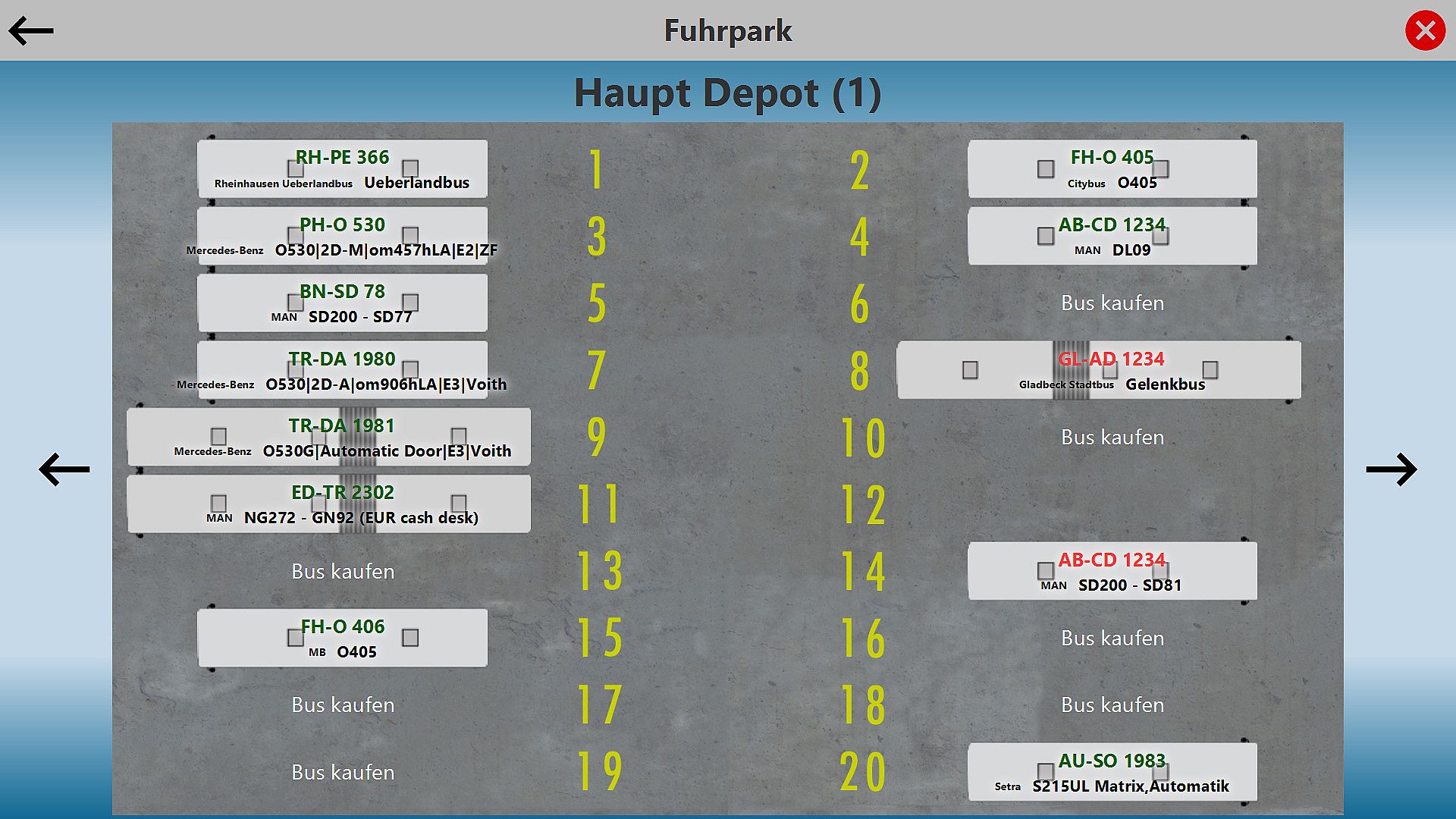 The player can join an existing bus company online, meet his colleagues at the 3D depot, chat with them, carry out inspections, organise shift schedules, and much more. After he has accumulated a bit of money and experience, the player can found his own company online, hire employees, buy more route licences, expand the bus depot, and thereby build up his own bus empire. In the single player mode, the player can even start with his own company right away.