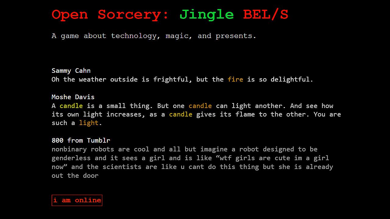 Before you start looking for a cheap Open Sorcery: Jingle BEL/S key, check the essentials. Developed by Abigail Corfman. Published by Open Sorcery Games. PC released date: 17 Dec 2018. Genres: Indie, RPG, Adventure. Categories: Family Sharing, Steam Trading Cards, Single-player, Downloadable Content, Steam Achievements.