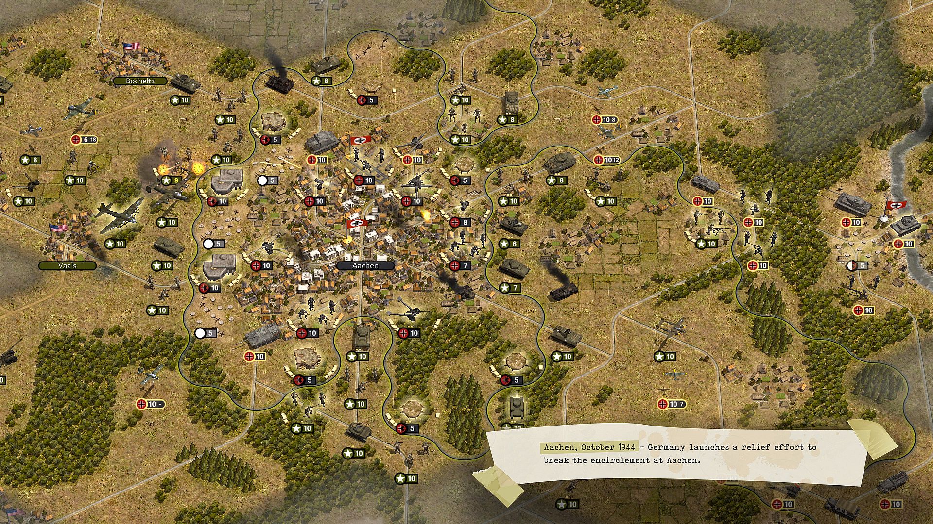 In the second part of the campaign the player's forces are transferred to the west, where the Allied invasion of Normandy has opened a new front. Initially you'll be forced on the defensive, and you'll be tasked to extract other German forces from the Falaise trap, defeat Allied airborne units in Market-Garden, and defend the city of Aachen and the Huertgenwald against heavy attacks. By reaching a decisive victory in the German Ardennes Offensive in December 1944 the tide of the war can finally be turned again, leading to a set of ultimate battles to destroy the Allied armies once and for all.