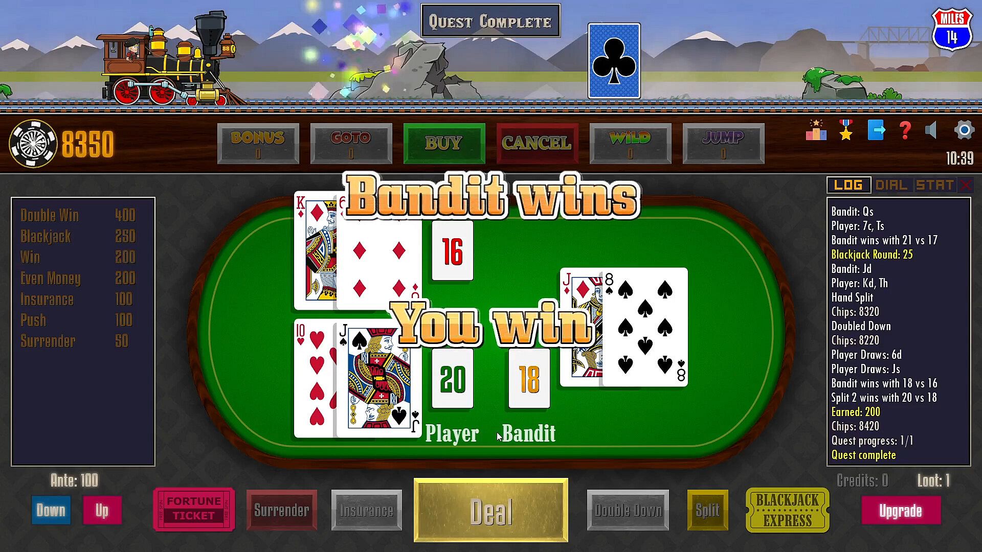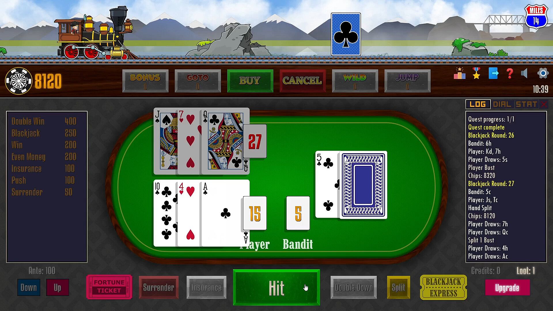 Challenge the Bandits at the Blackjack table with increased antes ranging from 100 to 500.